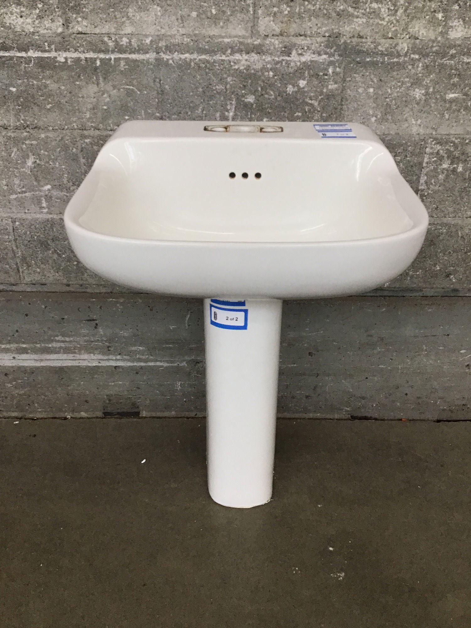 Good-looking pedestal sink with holes for a faucet with 4" centers.