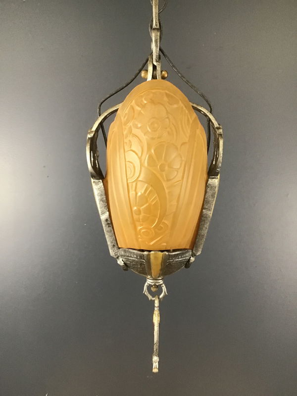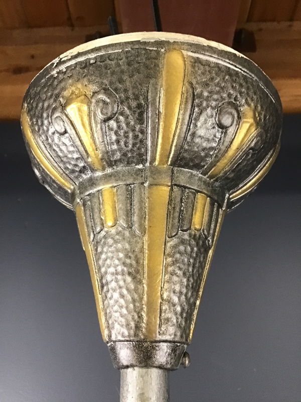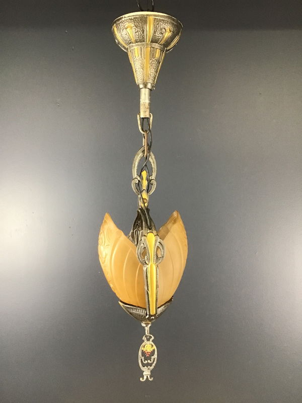 Super clean vintage slip shade pendant light with two intact shades and nice polychrome finish. Has a thumbturn switch on the bottom. This light was not rewired by our light shop, but it looks like it was done by someone.