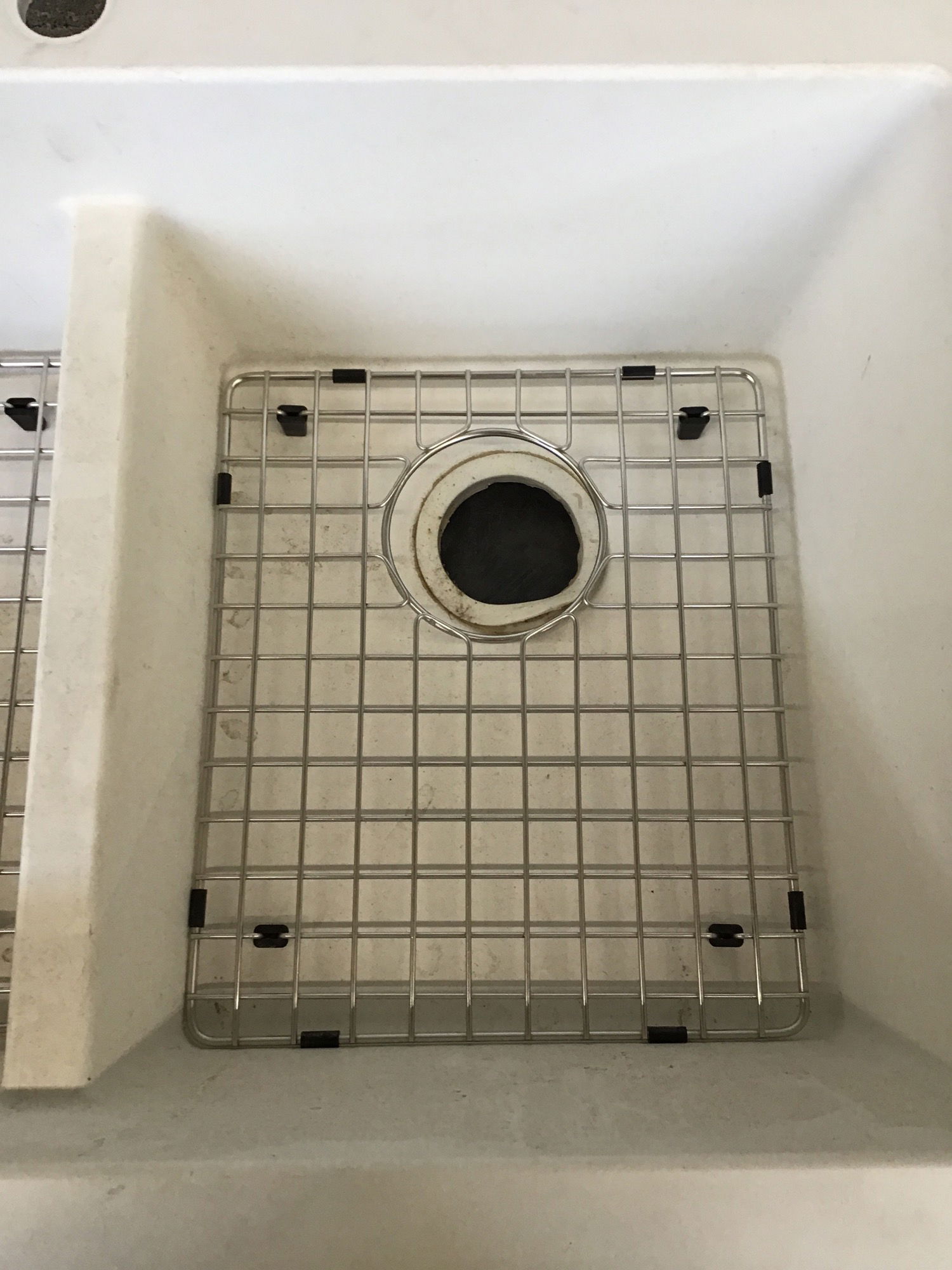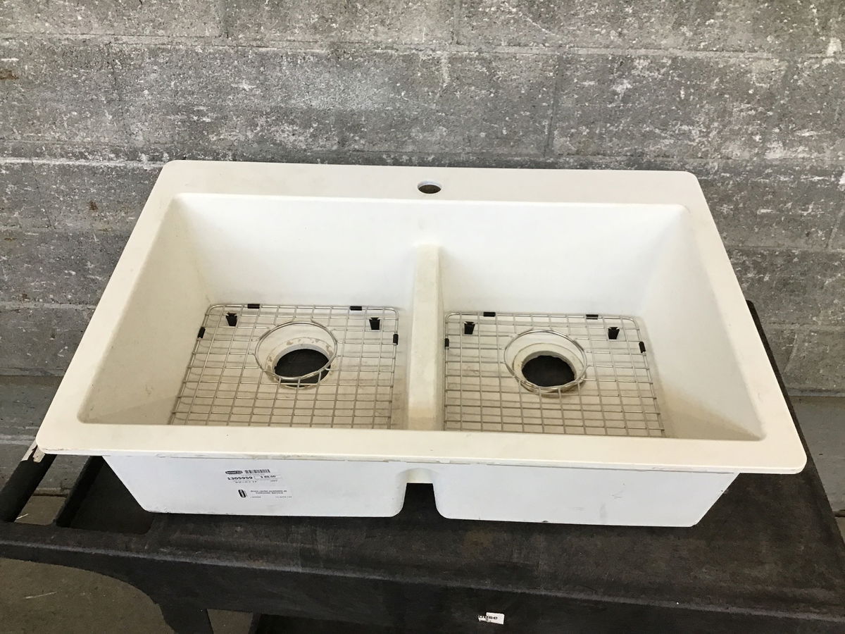 Matte white composite drop in sink with a single faucet hole and drain racks for both basins.