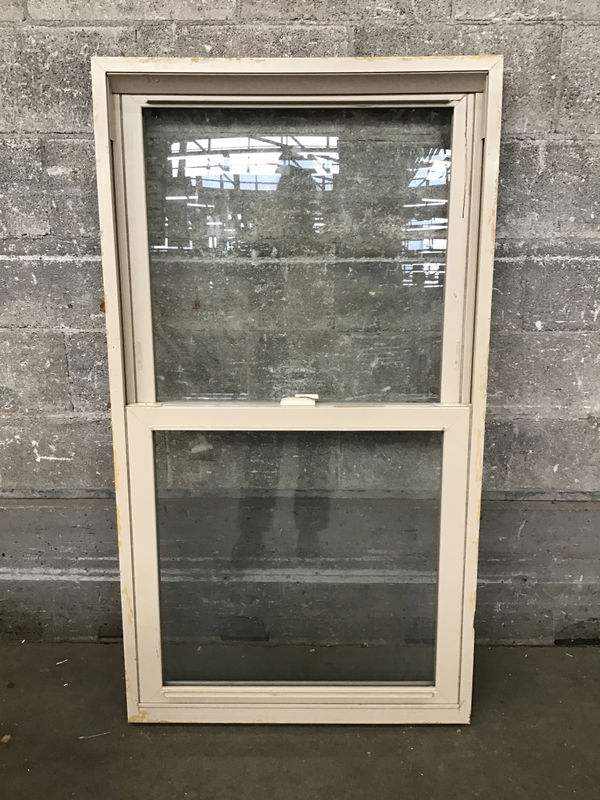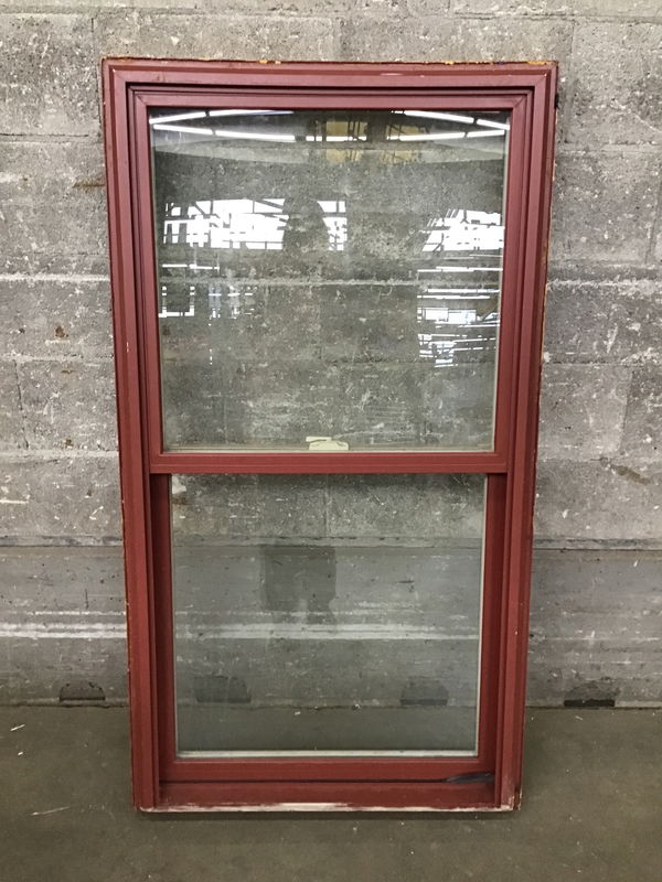 Simonton (PlyGem) beige vinyl double hung window that's been painted brick red on the outside.