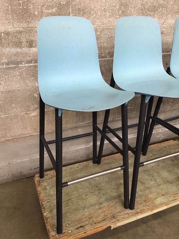 Made in Italy by Kristalia, this modern indoor/outdoor stool has been well loved and has more to give! Steel legs support a polyurethane high backed seat. Seat comes off the legs with a few screws, would be an easy repainting job! These retail for $600+ new. Get em while they're hot ! This is a bulk item; photo is representational, no holds please.