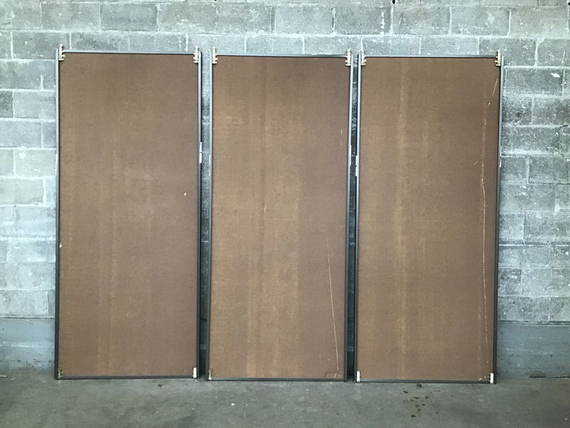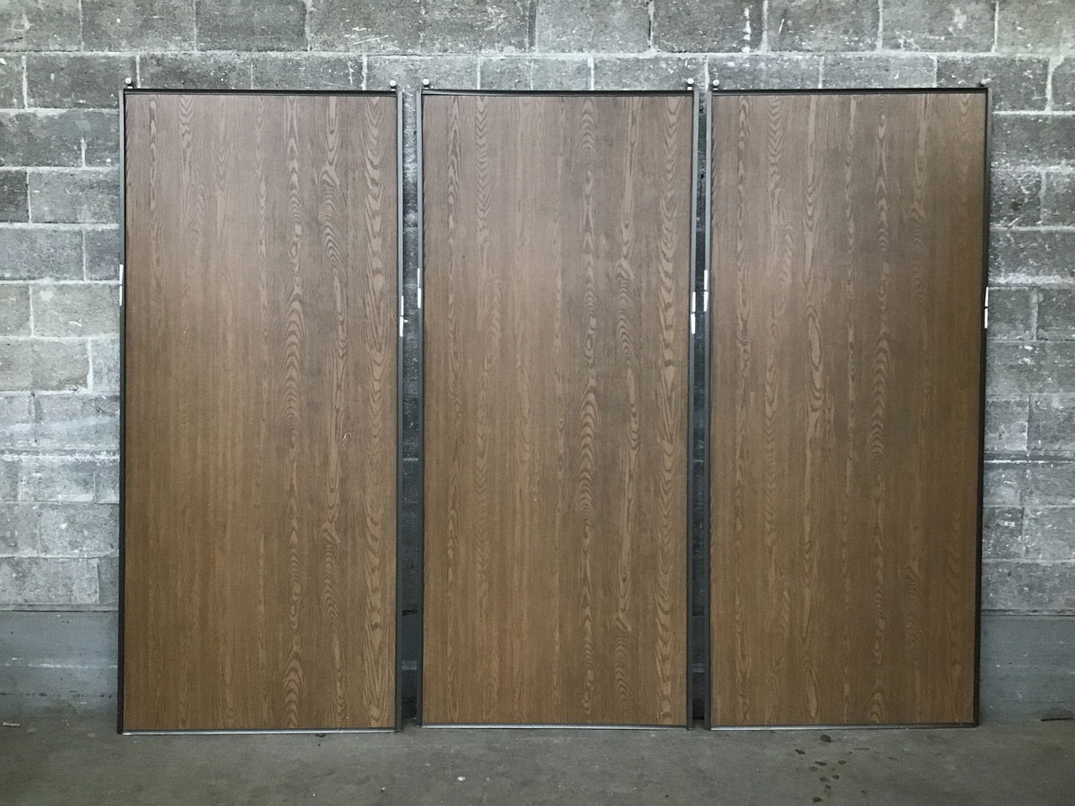 A set of three lightweight panel sliders with a plastic or vinyl panel inside of steel frame construction, made to resemble oak grain.