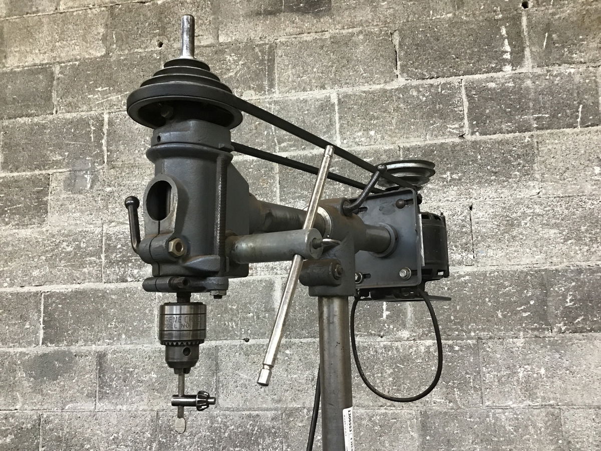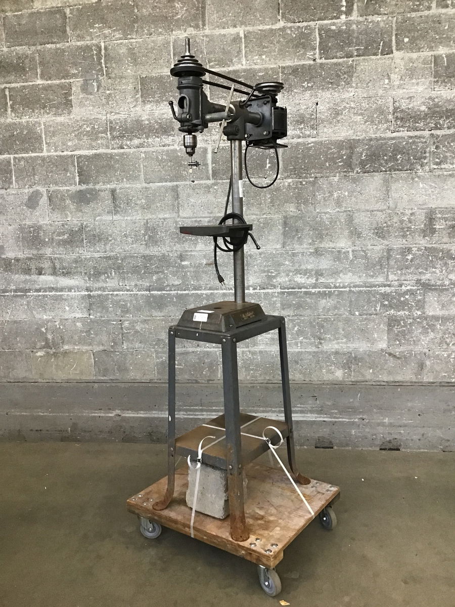 Rockwell drill press, with a craftsman motor and supreme chuck. Series No. 11-280, Serial No. FD-7517. This drill press is very unique as it has a tilting feature that allows the angle of the drill to be adjusted to various degrees. Tested in house and seems very functional.