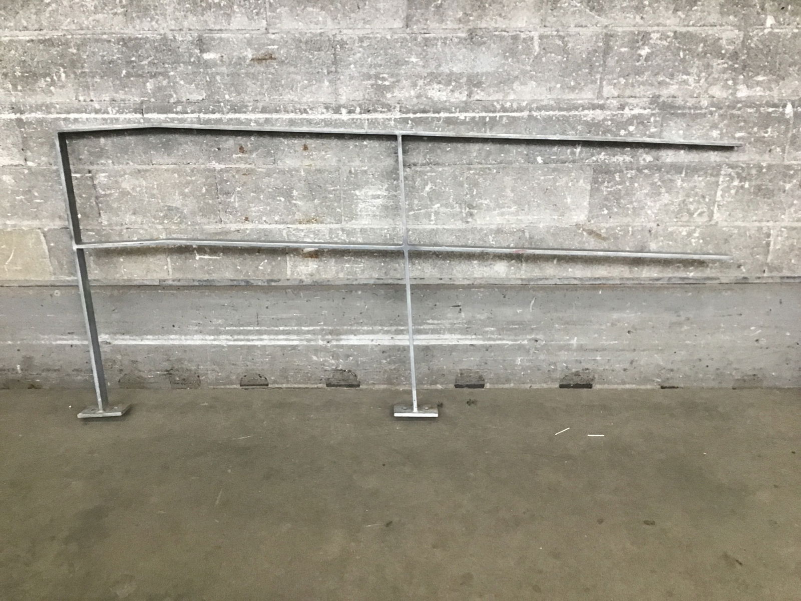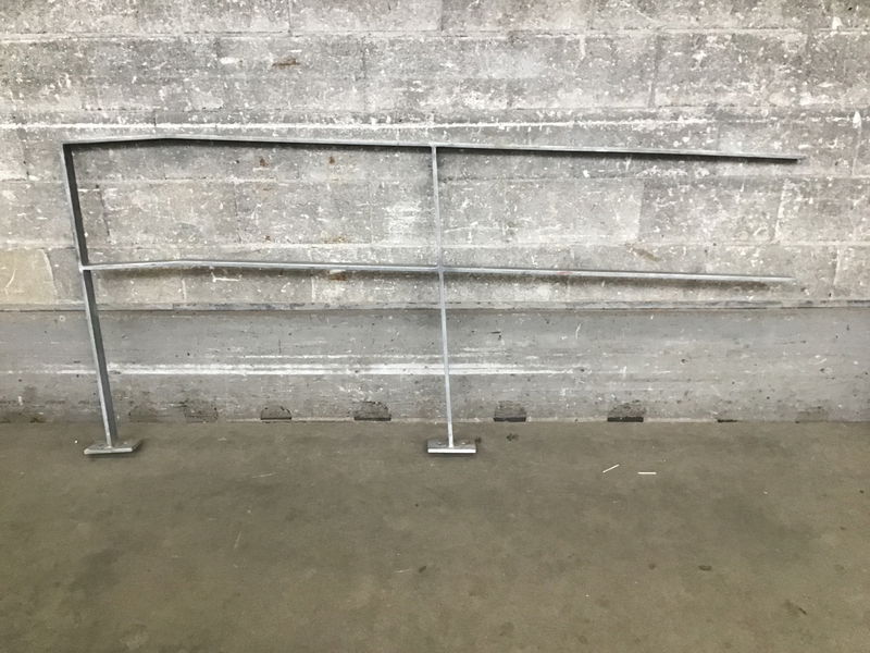 Section of galvanized steel railing with two feet to mount it to the ground.