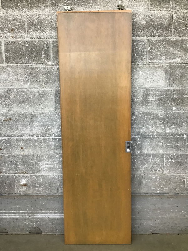 Flush face, darkish stained fir veneer hollow core pocket door. Has some wear up at the top from rolling in and out of pocket door frame.