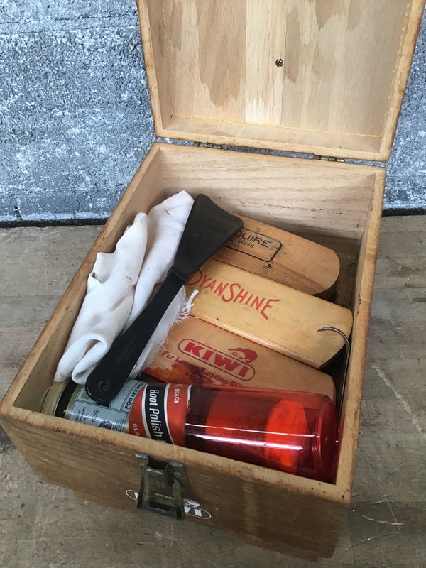 This is a Kiwi brand shoe shining kit that comes in an oak box that includes three brushes, some tools, and a rag.