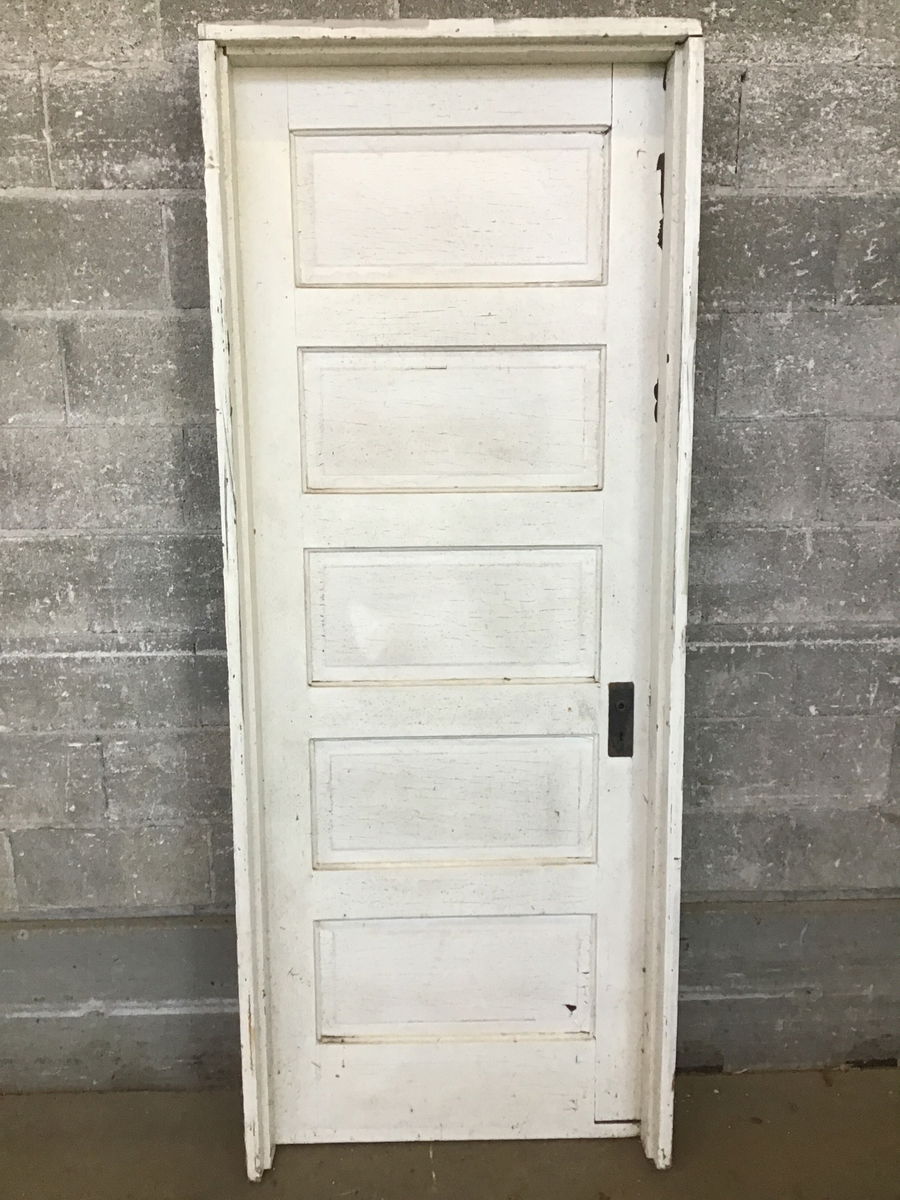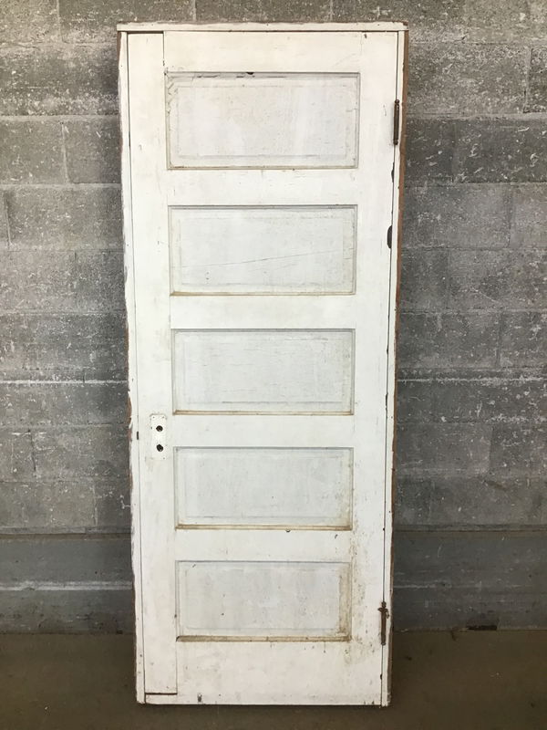 Vintage raised five panel interior door in a jamb. Top latch side joint needs repair and paint is starting to peel. Price reflects.