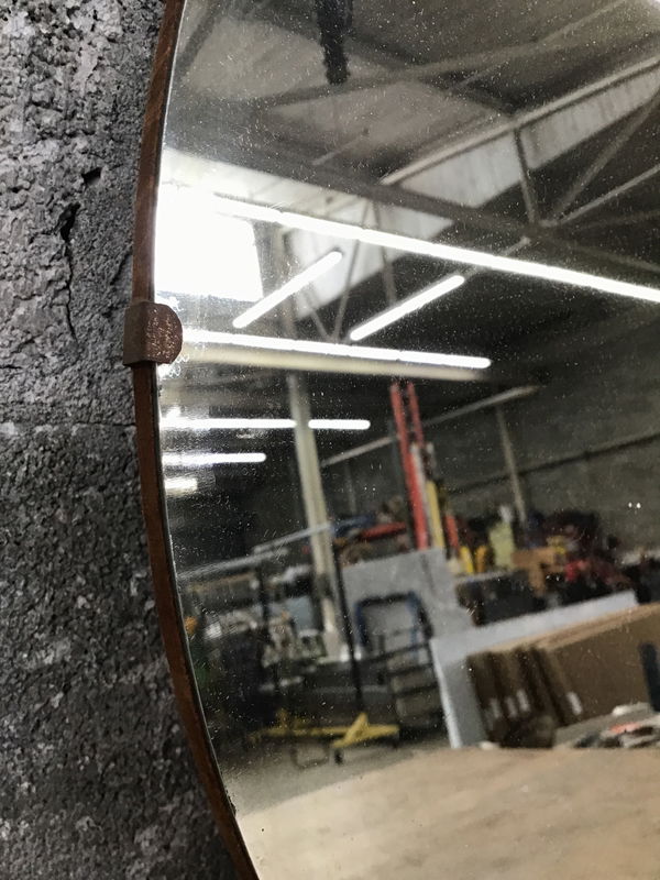 Vintage round mirror with an MDF backing. Mirror has no chips and only very minor wear in a couple spots.