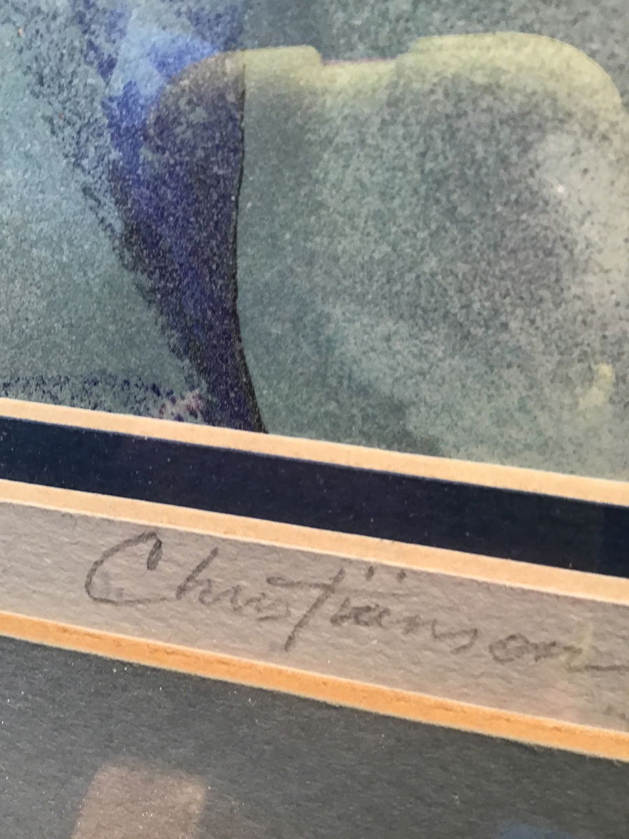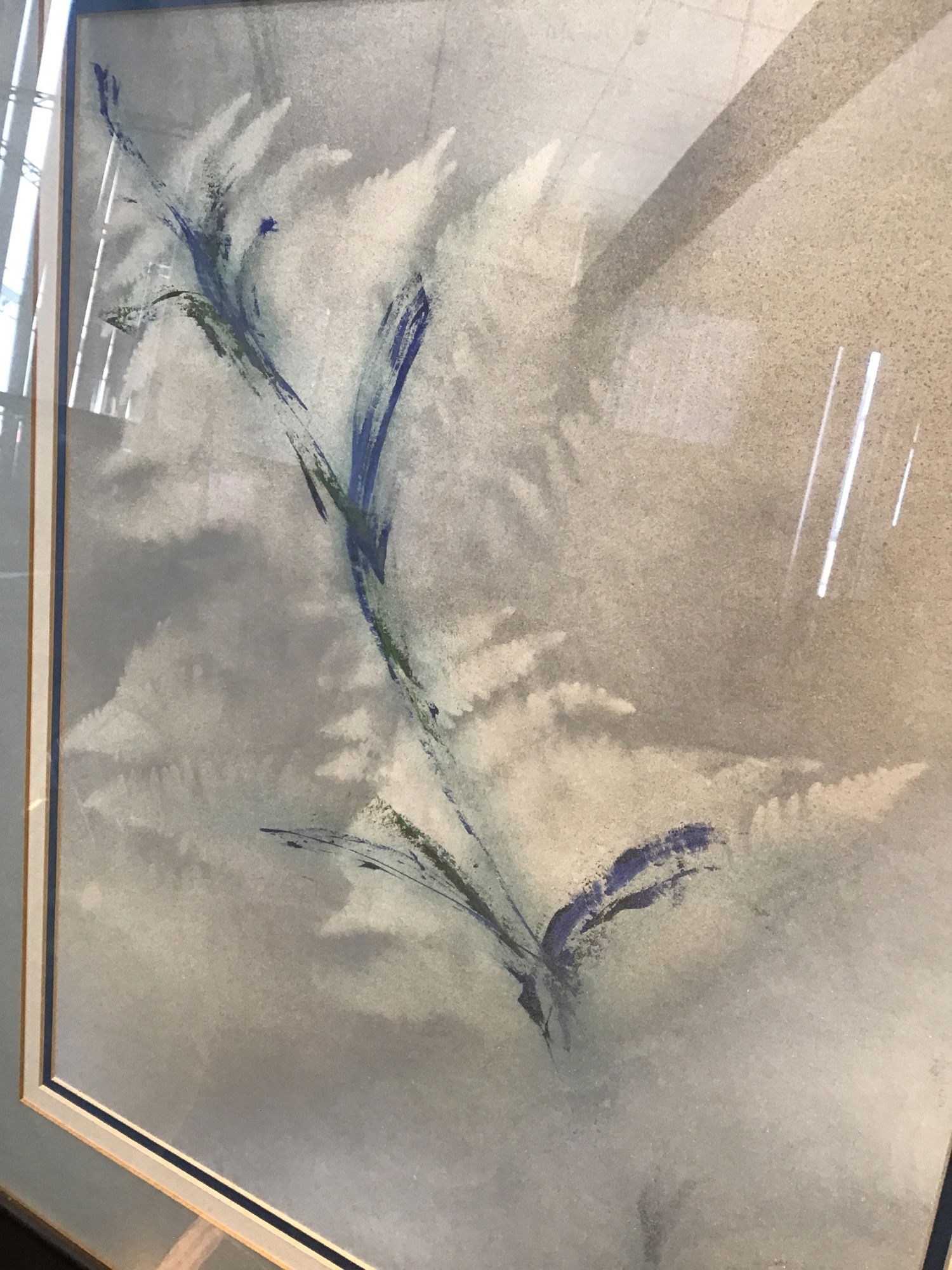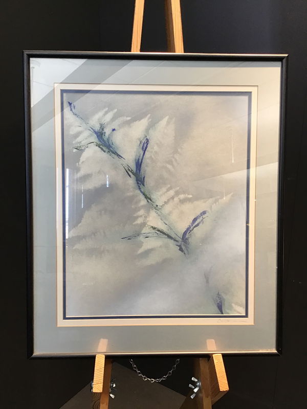 Nicely framed watercolor print of a few pretty minimalist flowers? Blues and greens ascend up into the top left corner with cloud like white behind them. Signed in the bottom left corner.
