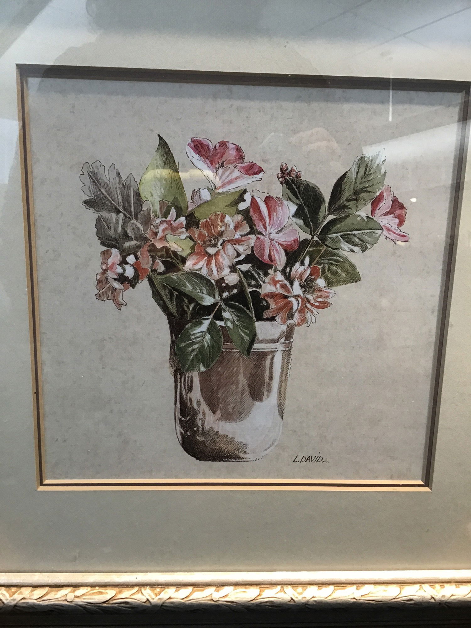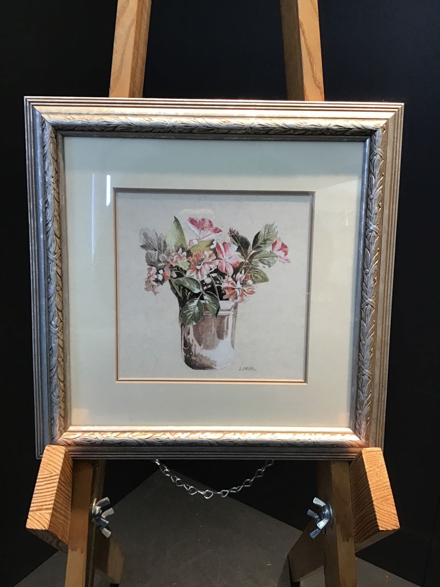 Nice little print of a beautiful sketch of flowers in a vase. Seems to be painted by an L.David (probably not Larry) and comes in a great silver leaf frame with nice floral designs on the border.