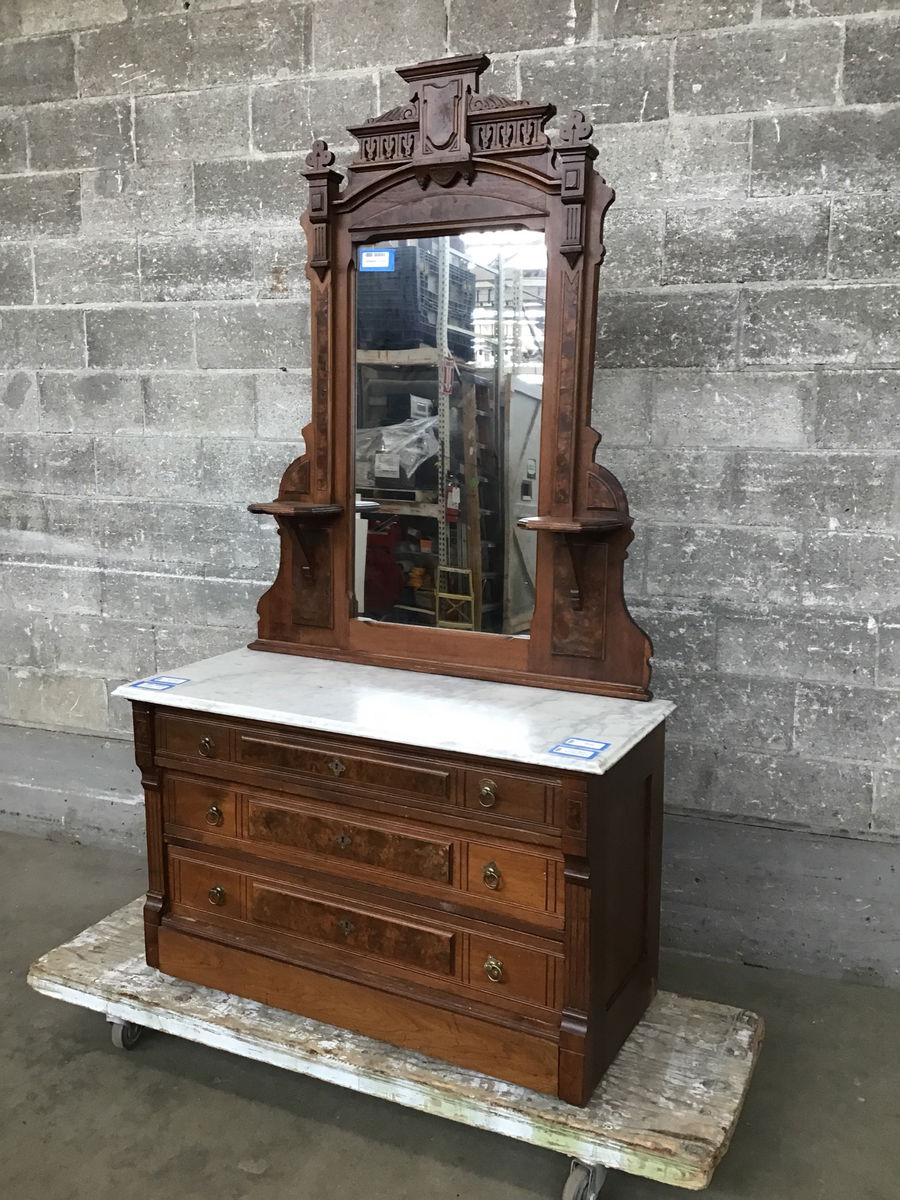 Antique Walnut Burl Dresser w/ Mirror & Marble Top