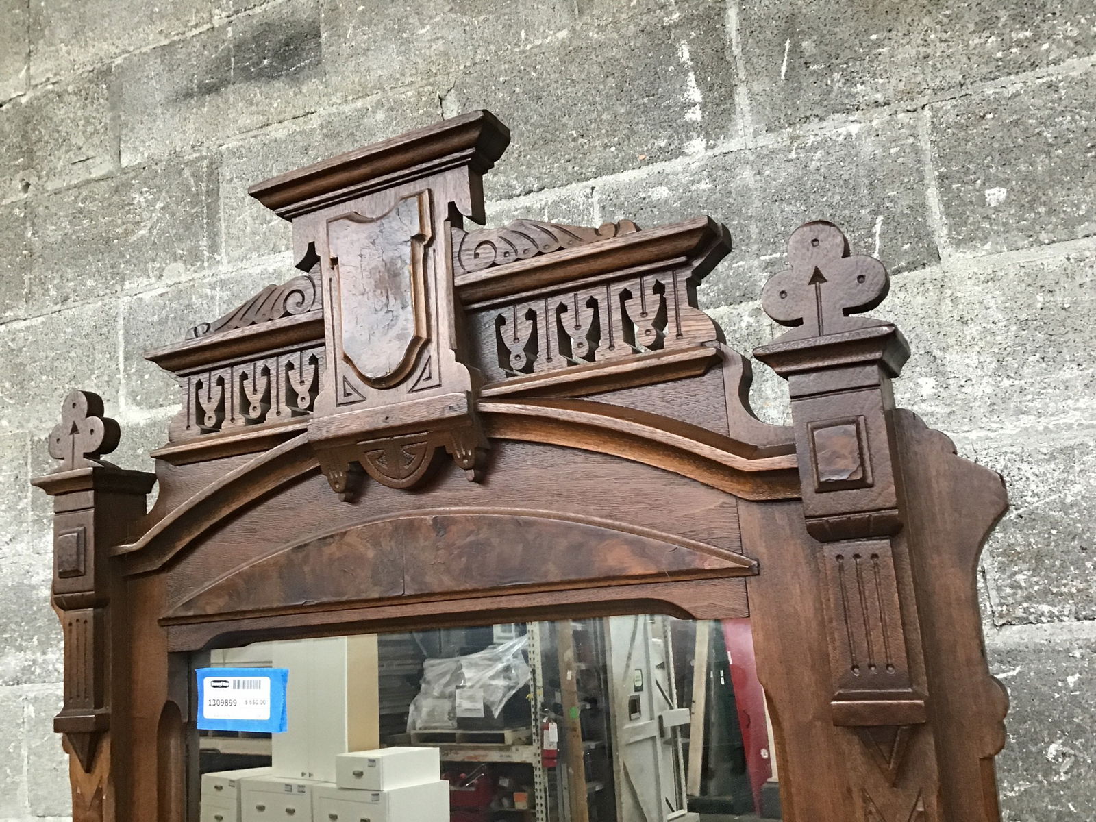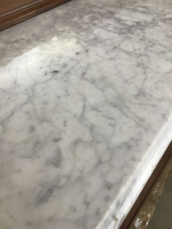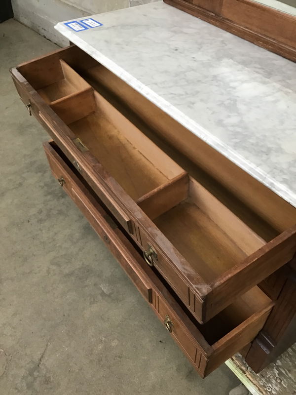 A true turn of the century wonder, this antique dresser showcases gorgeous walnut burl detailing, a white marble top and a glamorous mirror flanked by a plethora of golden-age ornate flair. With two small shelvings on the mirror and three tiers of drawer storage, this marvel is ready to add a refined sense of style to your home.