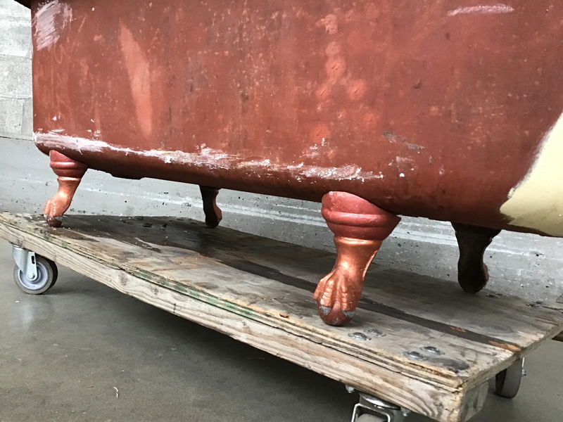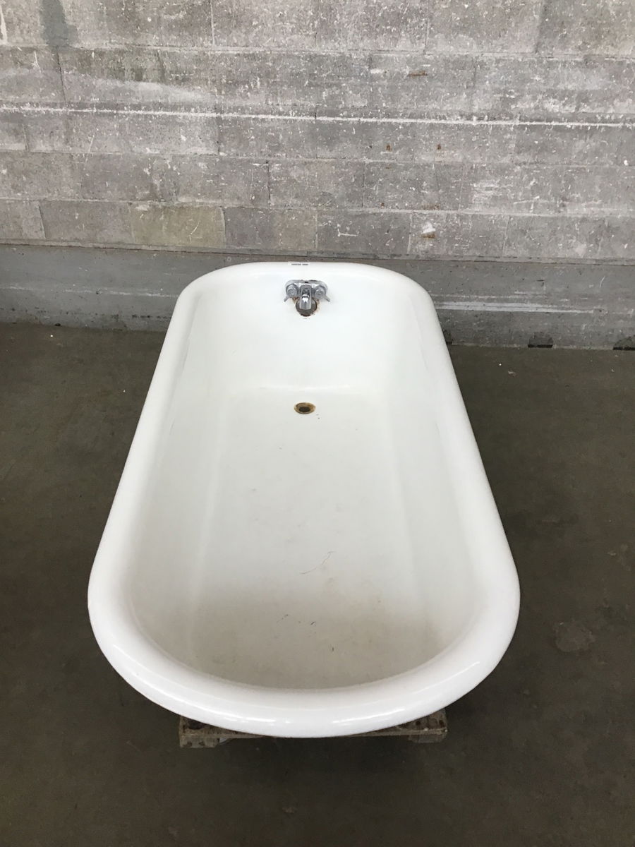 One of the cleaner clawfoot tubs we've had in quite a while. There are no deal breaker/significant flaws on this one. The area around the drain is free or rust. There's no excessive wear under the overflow from a leaky faucet and no chips around the lip. The tub does show some surface scratches that are typical with normal use, but it still has surprisingly good luster. No rust on the bottom and the feet are all in great condition with good set screws. The only thing to knock it down a peg is there is some light pitting in the basin.