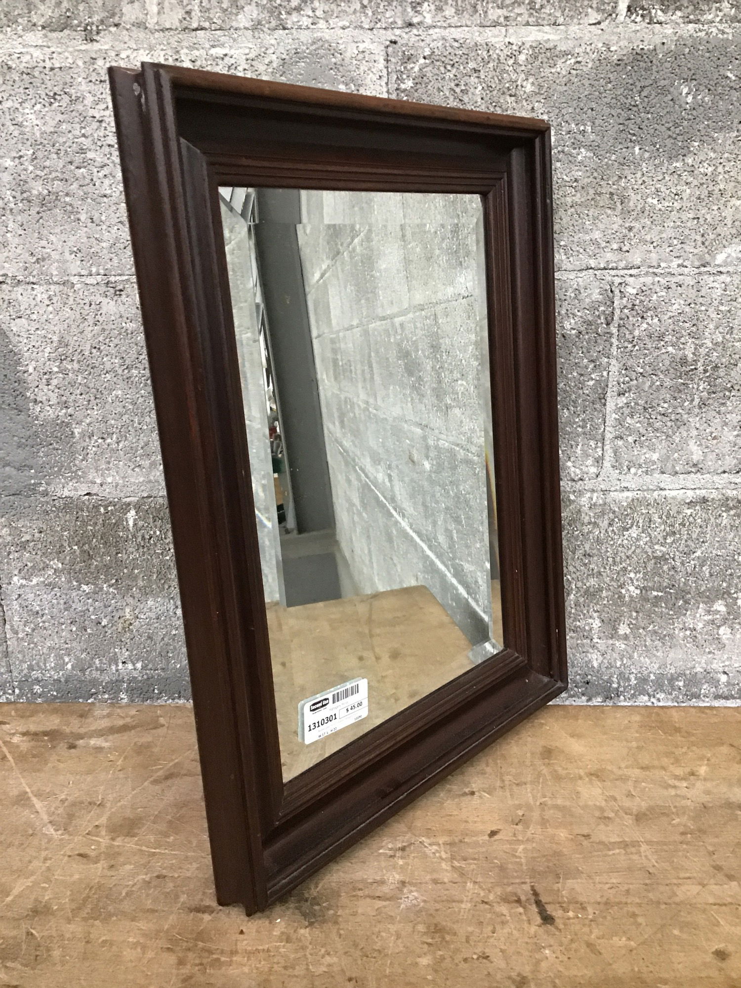 Beveled glass mirror in a solid mahogany frame.
