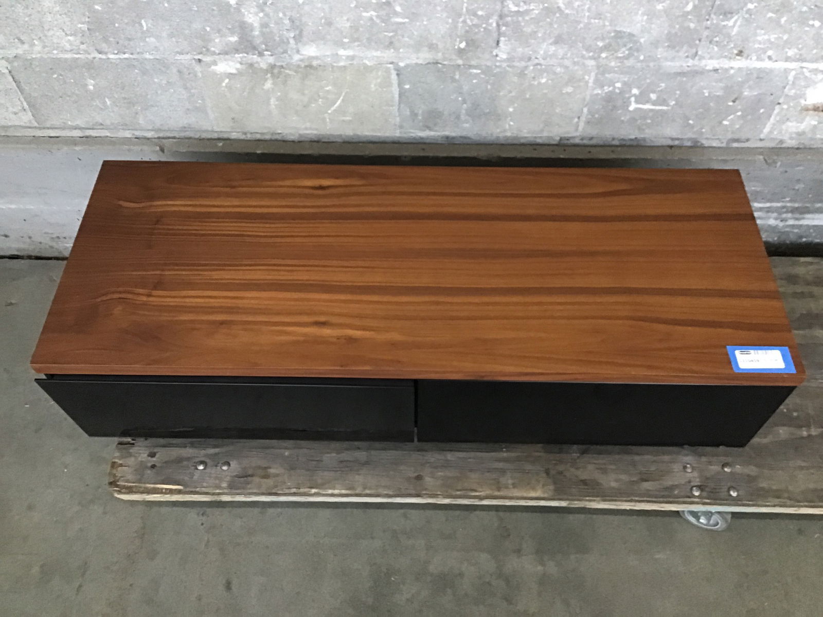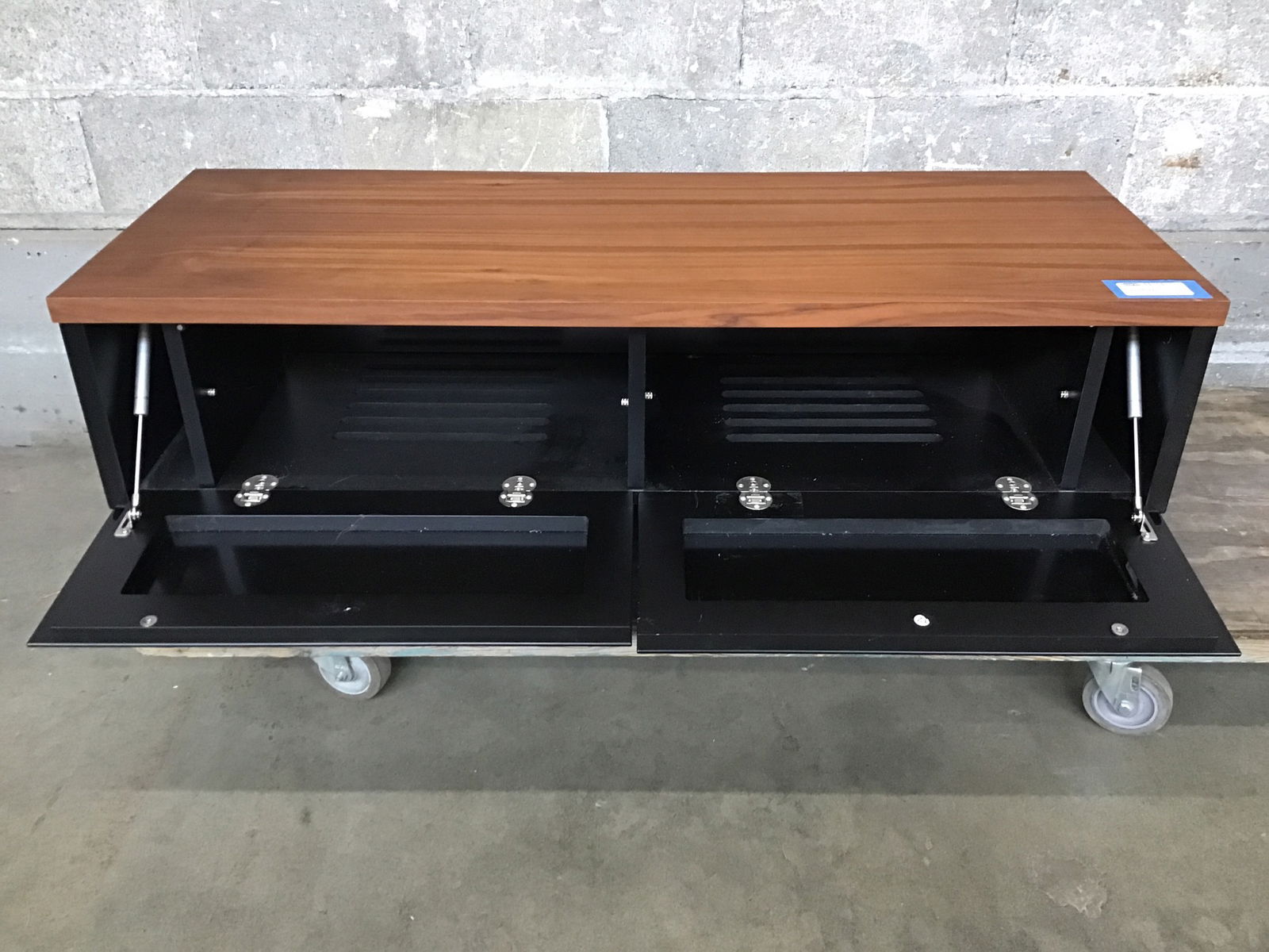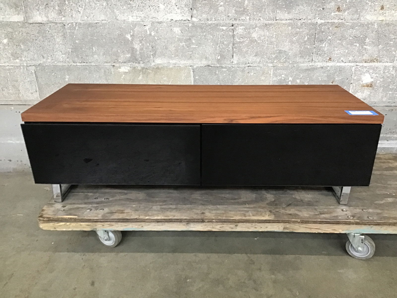 Sleek coffee table/ media console with tempered glass drop-down doors, chrome legs and a beautifully veneered tropical hardwood top.