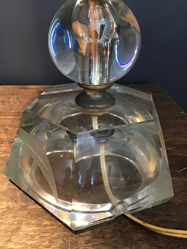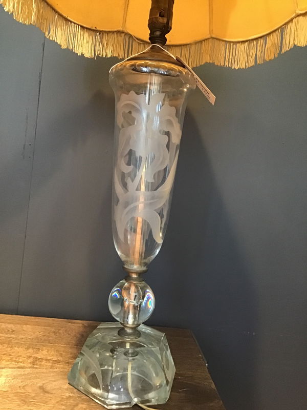 Gorgeous mid-century table lamp with ornate shade. Etched glass design on a vase-shaped body with a glass rod going through the center, sitting on a glass hexagonal base. Shade is not in the best shape but is still beautiful in design with lovely fringe around it. Missing a finial so shade is loose.