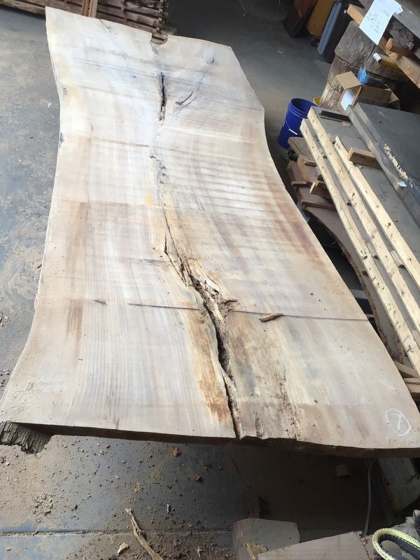 Locally milled and kiln dried. This giant slab came from a humongous English Elm tree that was taken down in Capital Hill over ten years ago and has been slowly curing since then. It was recently put into a kin to ensure any critters were nuked. It has checking down the center/bark inclusion and a void on one end. Is very flat for an unsurfaced slab, would lose very little thickness in leveling. Would be a great candidate for some resin river work. Tapers in width from 59" to 46" to 53". Has some nails about 3ft in on the wide end, can be drilled out.