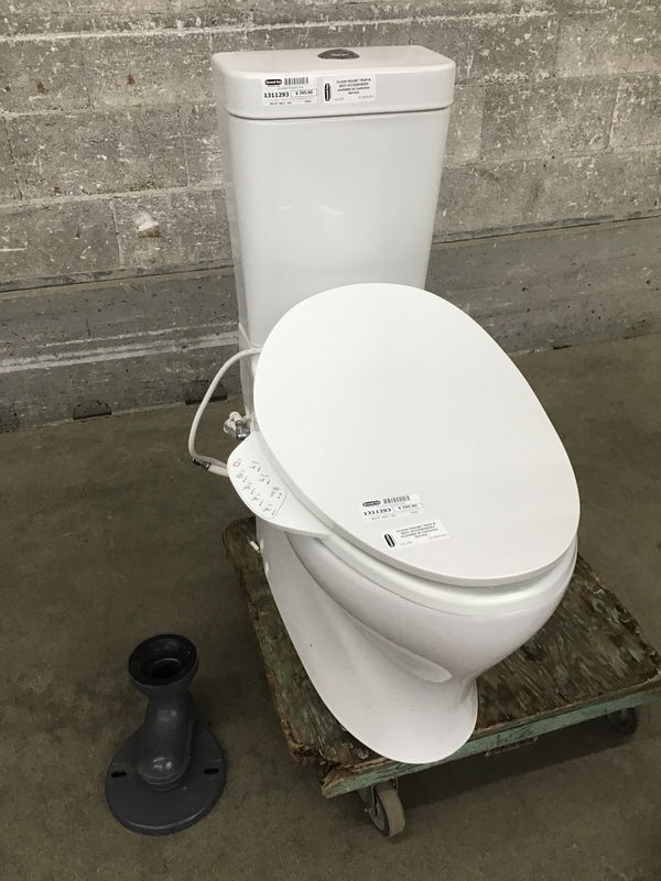 Ca. 2016 Kohler "Persuade" two piece, elongated bowl, comfort height toilet with a bidet style seat attached and dual flush options (1.0 & 1.6 GPF). Looks like this model is still available from Ferguson or Kohler's website for $676--without the add on seat. .