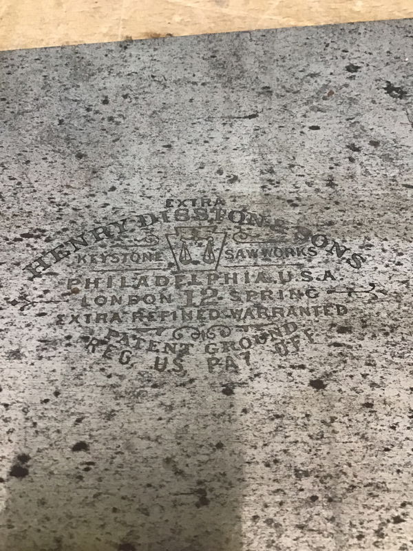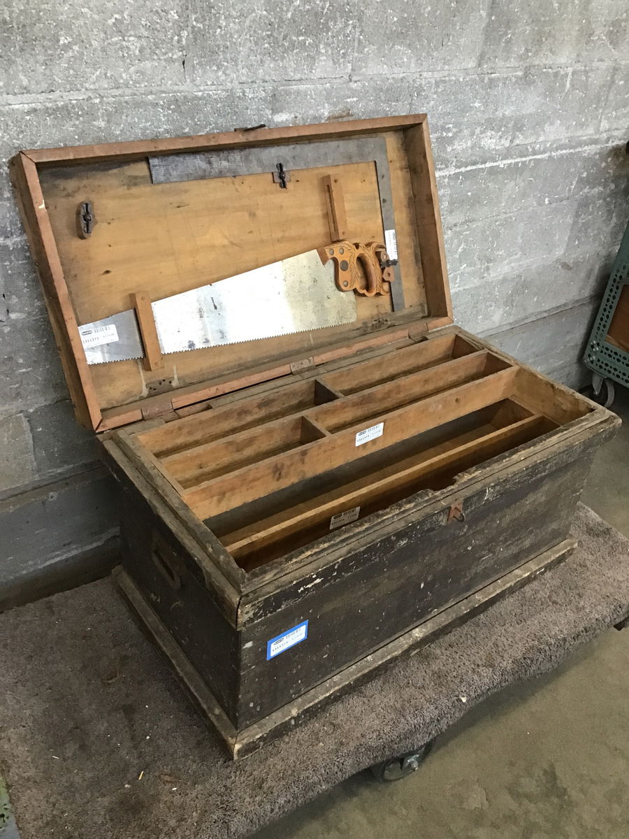 Vintage wood carpenter's tool box with two sliding, lift out trays, a Nicholls framing square, and a good looking Disston No. 12 saw, which looks to run $75 on up on ebay. The box has some bug holes in it, but is still solid.