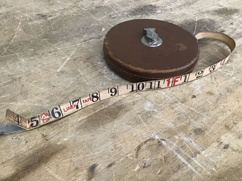 Vintage 100 foot long fabric tape measure made by Lufkin Rule Co. Has a leather shell. Tail has been accurately replaced.
