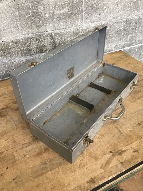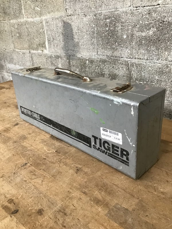 It's a metal toolbox that looks to have once held a Tiger Saw by Porter Cable. Don't worry, we checked! There are no tigers inside waiting to eat you.