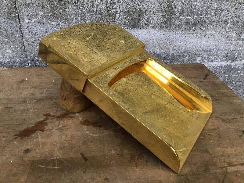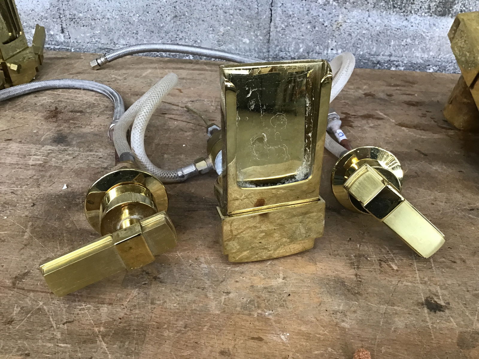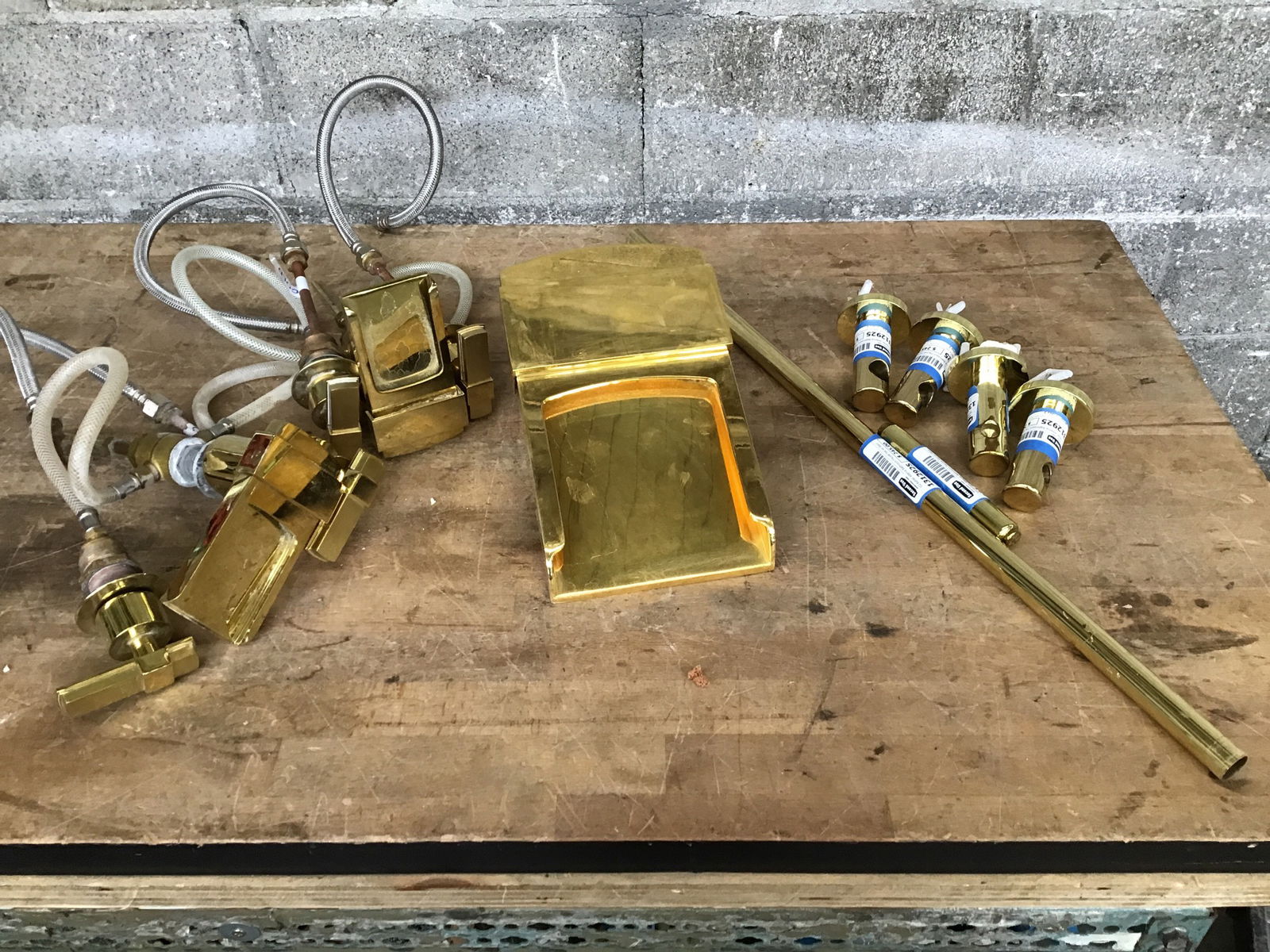 Ca. 2002 Kohler "Alterna" bathroom faucet set that includes two wide spread (8" on center), waterfall style faucets, a waterfall style tub fill (weighs at least 10 pounds, no mixer included), a towel bar and toilet paper holder. All have the same brass finish. They do show a little wear from use, but still look plenty usable.
