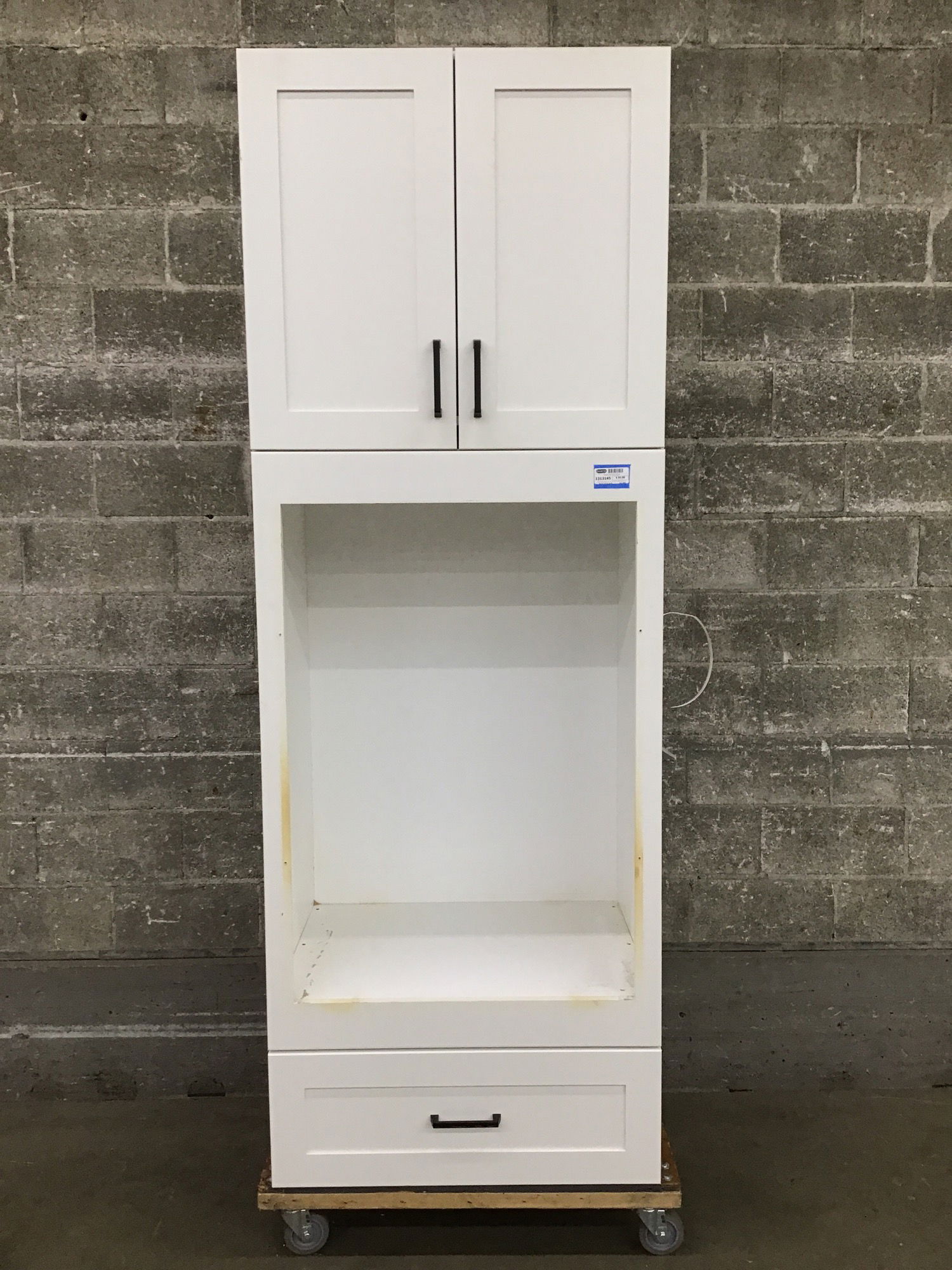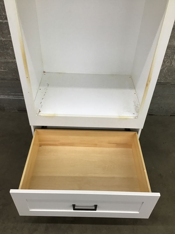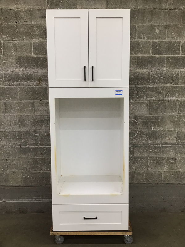 Well-made wall oven cabinet with shaker-style panels, two door upper cab with one adjustable shelf, and one full-extension soft-close dovetailed drawer underneath. Made to fit one of those one-and-a-half sized wall ovens (see other items on this job if you want the oven that came with it).