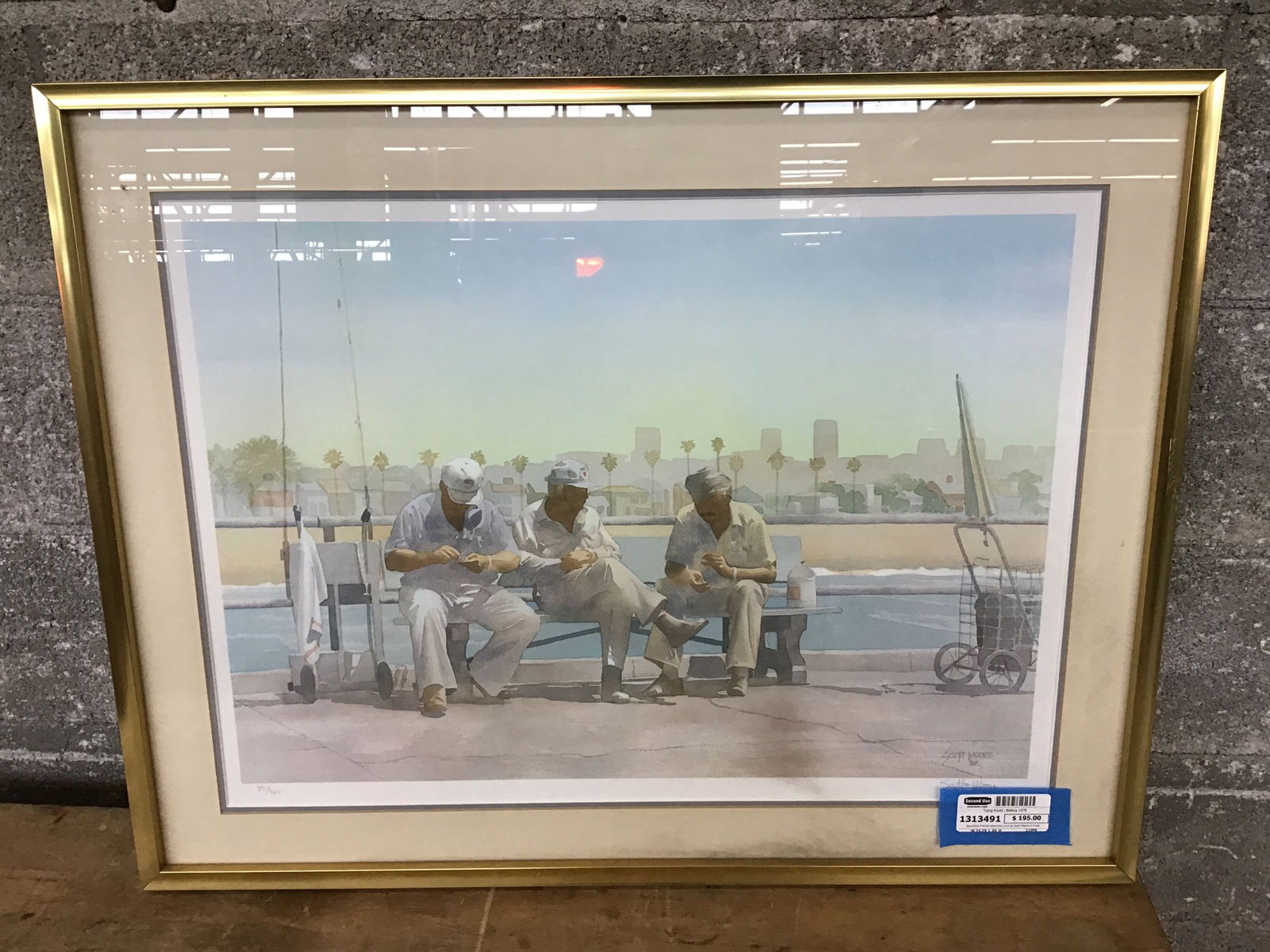 Beautifully framed watercolor print by Scott Moore of three folks in full sun in Balboa tying knots in preparation for some fishin'. The work has a sun drenched gauzy quality that really transports the viewer to sunny Southern California. Complete provenance for the piece and the artist is on the back, if you are curious.