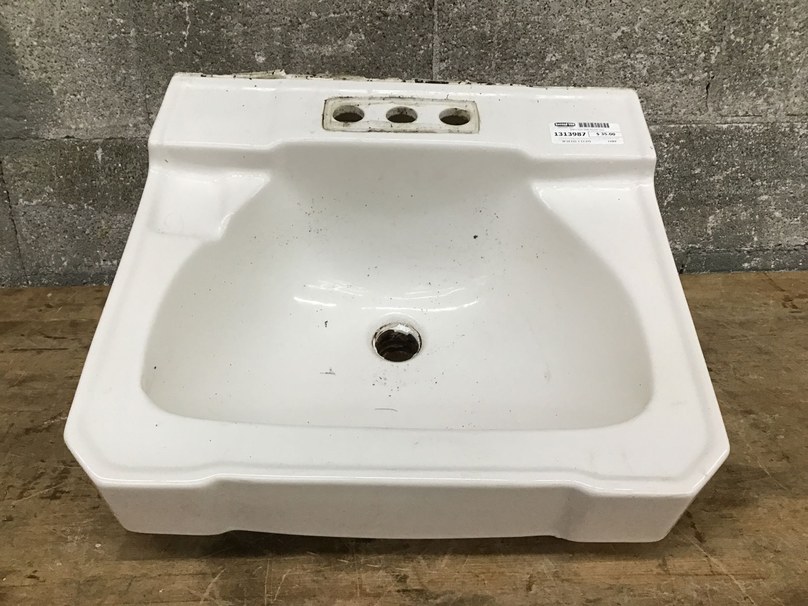 A sturdy mintage wall-mounted sink for your bathroom or workshop, complete with soap platforms and built-in backsplash.