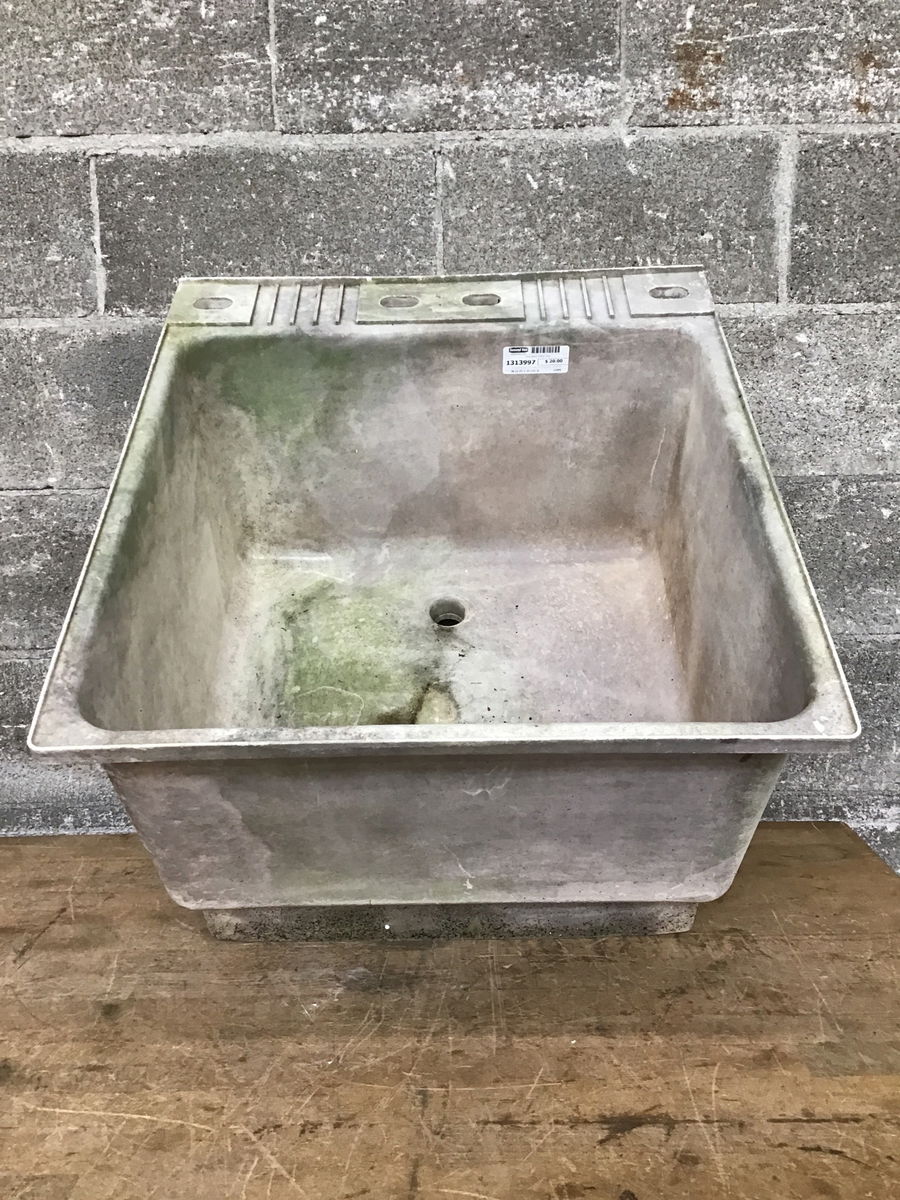 A standard utility sink made out of fiberglass. It's already seen some use but still has a lot left to offer for your workshop, laundry room, or basement.