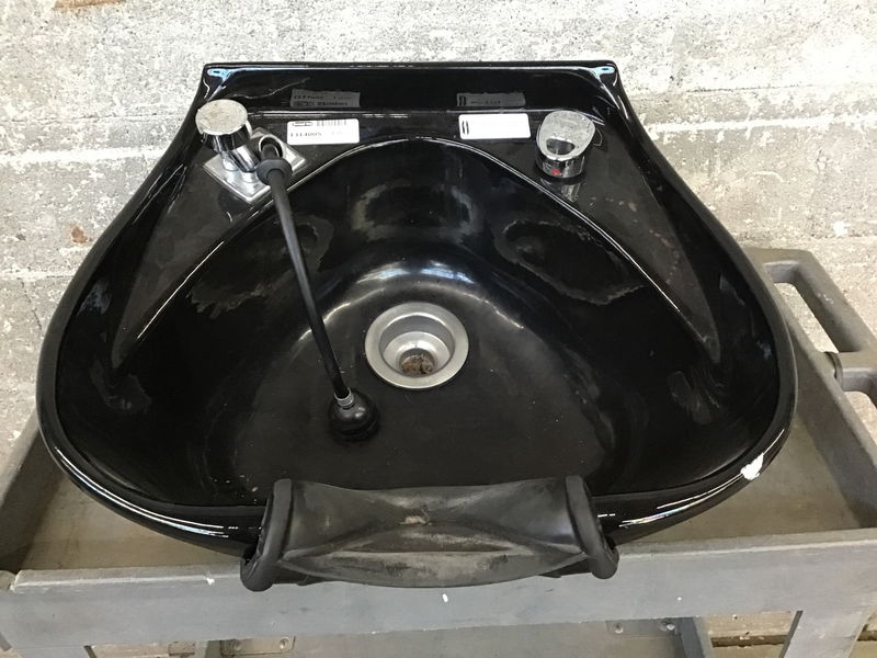 Simple black salon sink with faucet and mounting bracket. Needs a cleaning but in good shape overall.