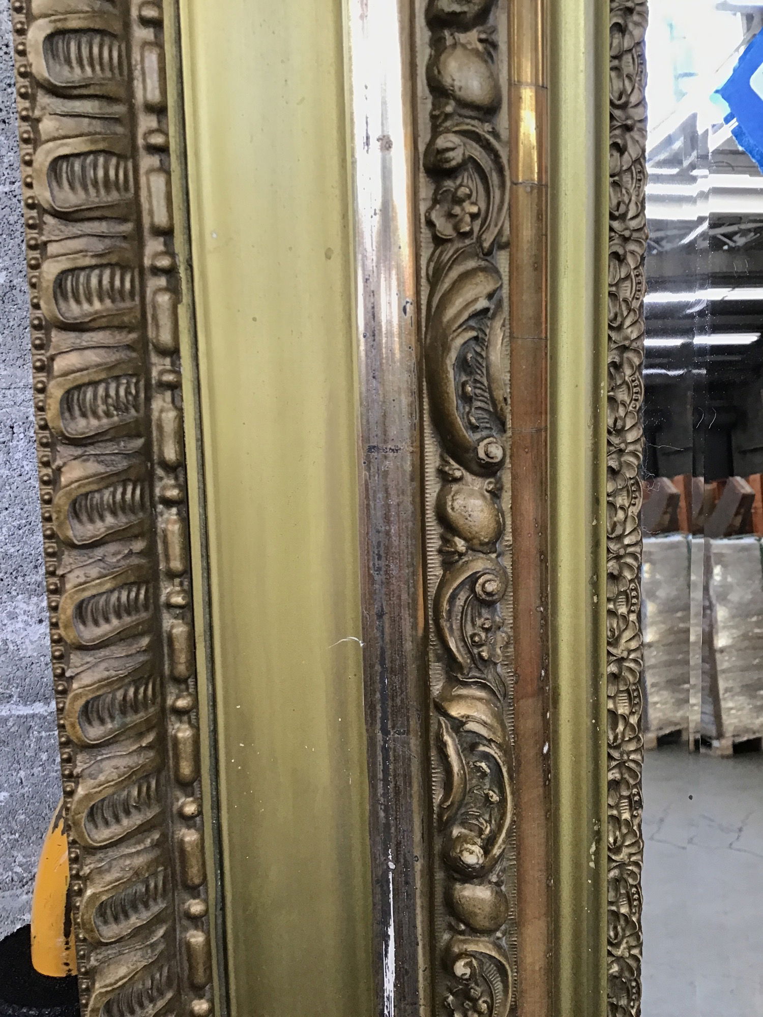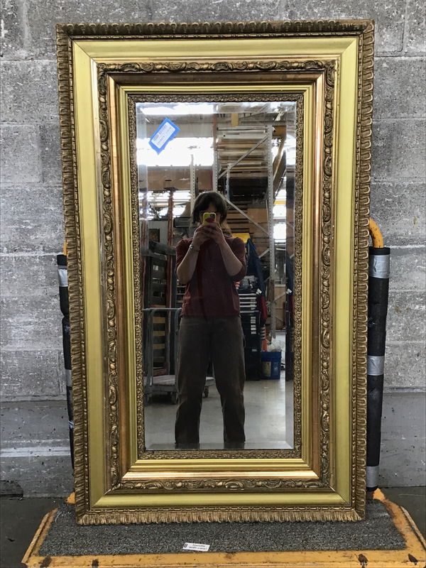 Big, beautiful wood and plaster framed mirror full of opulent organic details and gold, gold, gold. There are some imperfections in the frame but it is in good shape for its age. Can be hung horizontally or vertically.