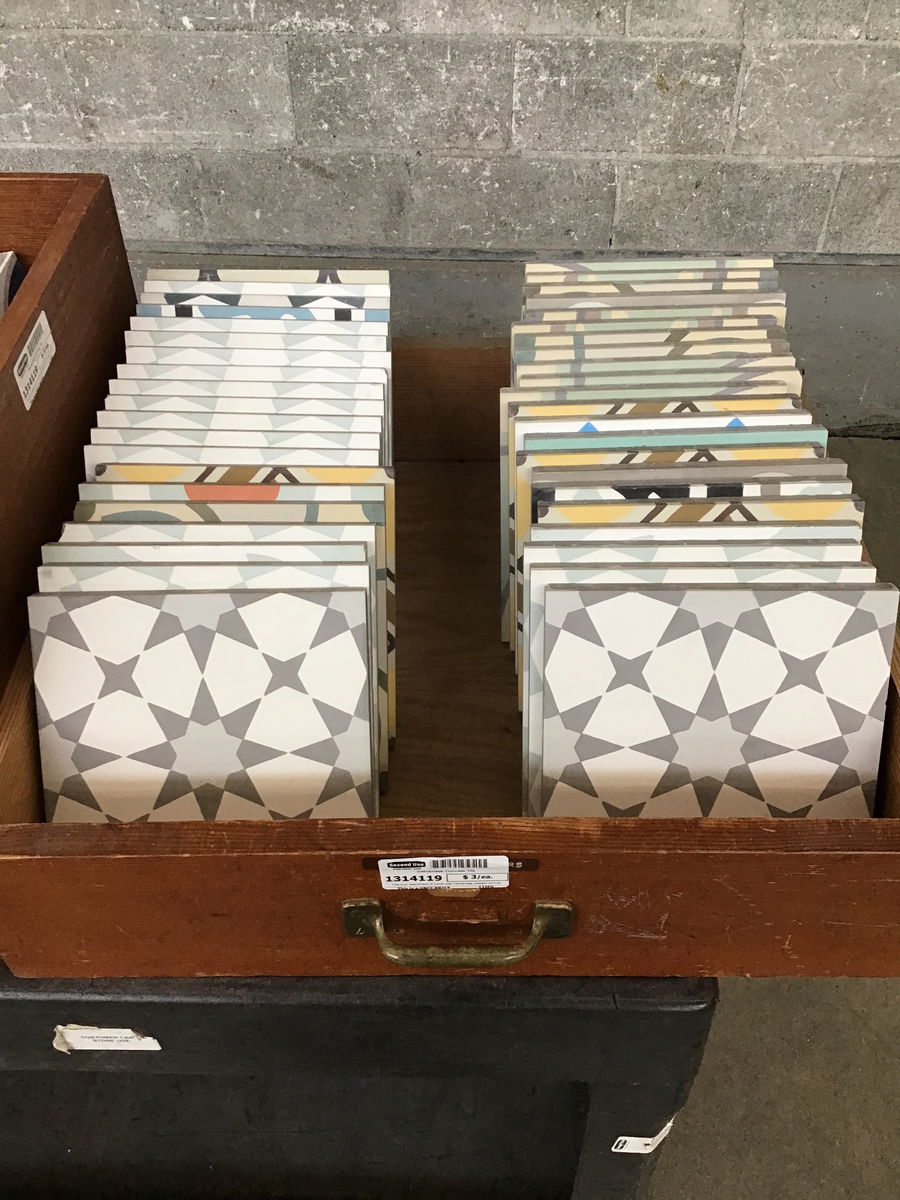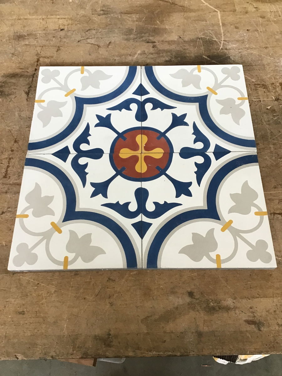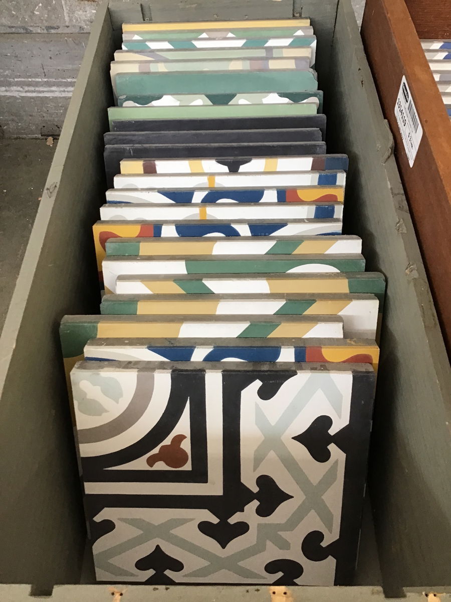 This is an assortment of handmade Vietnamese pressed concrete tiles that have different designs. Some do match but you will need to dig through and find matching sets. The boxes of assorted patterns are sold as "patchwork" sets. Info here. See similar ones selling here for $15/sf or $6.90 per tile.