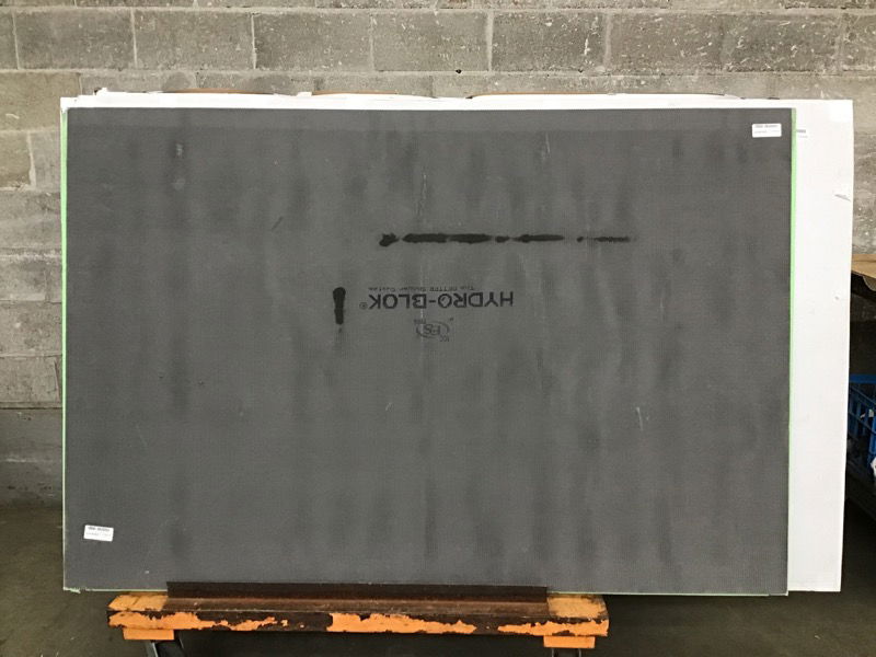 72 x 48 Hydro-Blok single-slope shower pan, new and still in the packaging. Manufacturer describes this as "100% waterproof XPS foam core, covered by fiberglass mesh for added strength, and then coated in a modified cement surface" for adding tile on top. Slope is between the longer sides. Image may be representational.