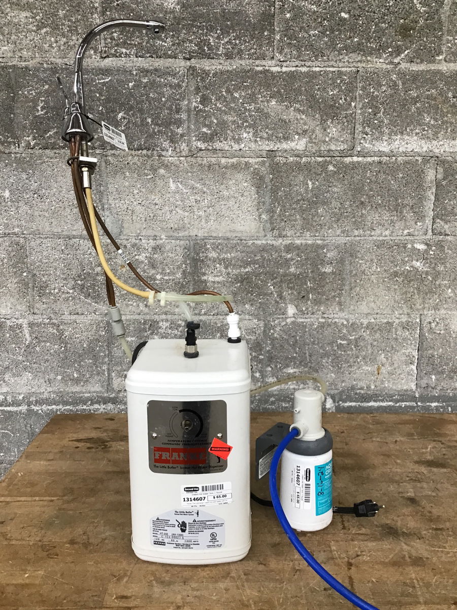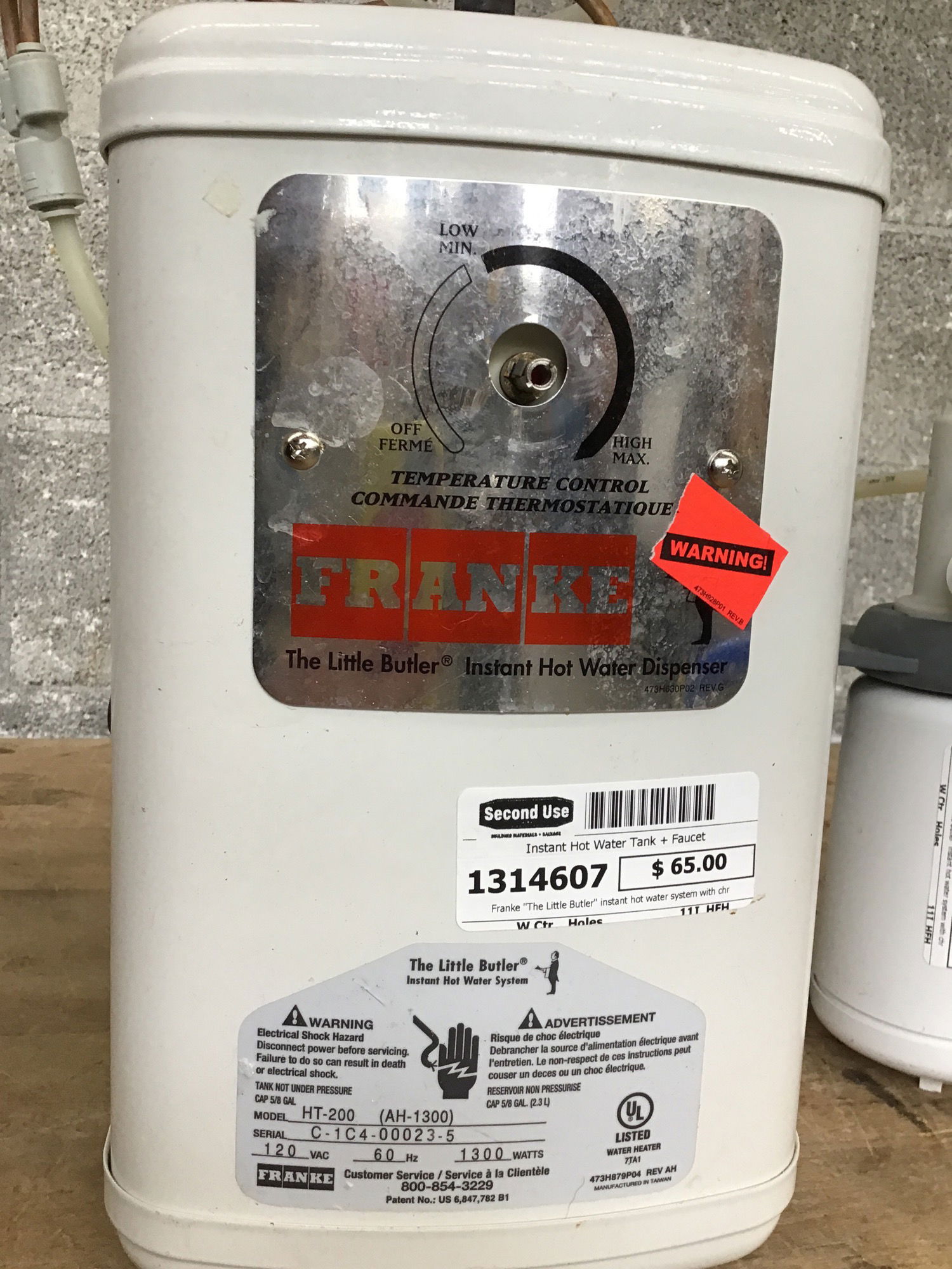 Franke "The Little Butler" instant hot water system with chrome faucet and filter. Model HT-200. Sold untested. Missing its knob, but its easy to turn it without it.