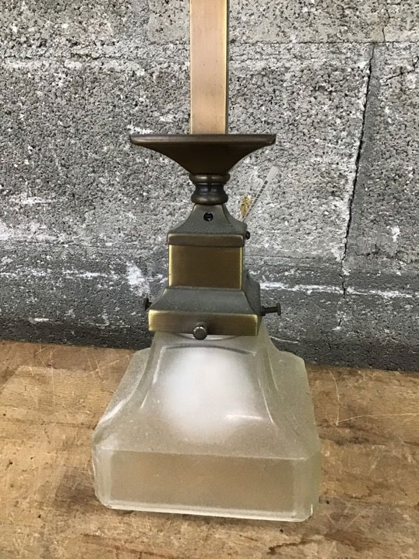Mission-style pendant light by Rejuvenation. Thick frosted glass shade and brass arm and canopy.