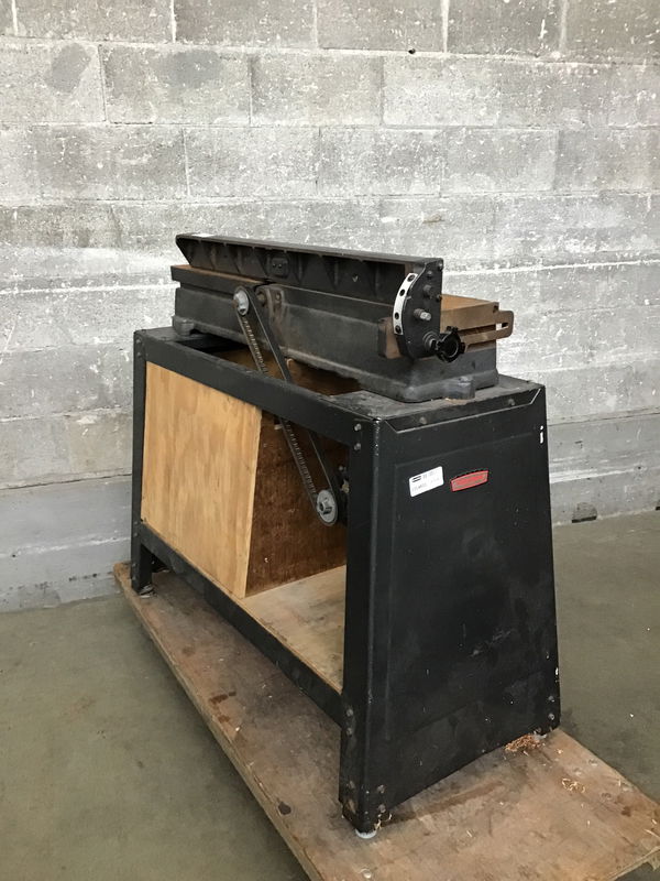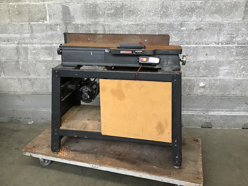 6" Jointer set up on a stand with dust collection box below. Nothing is seized though there is a bit of surface rust on plate. The knives are in decent shape and the belt is fine. Note: The on/off switch does not work but the motor ran fine when plugged in to power directly.