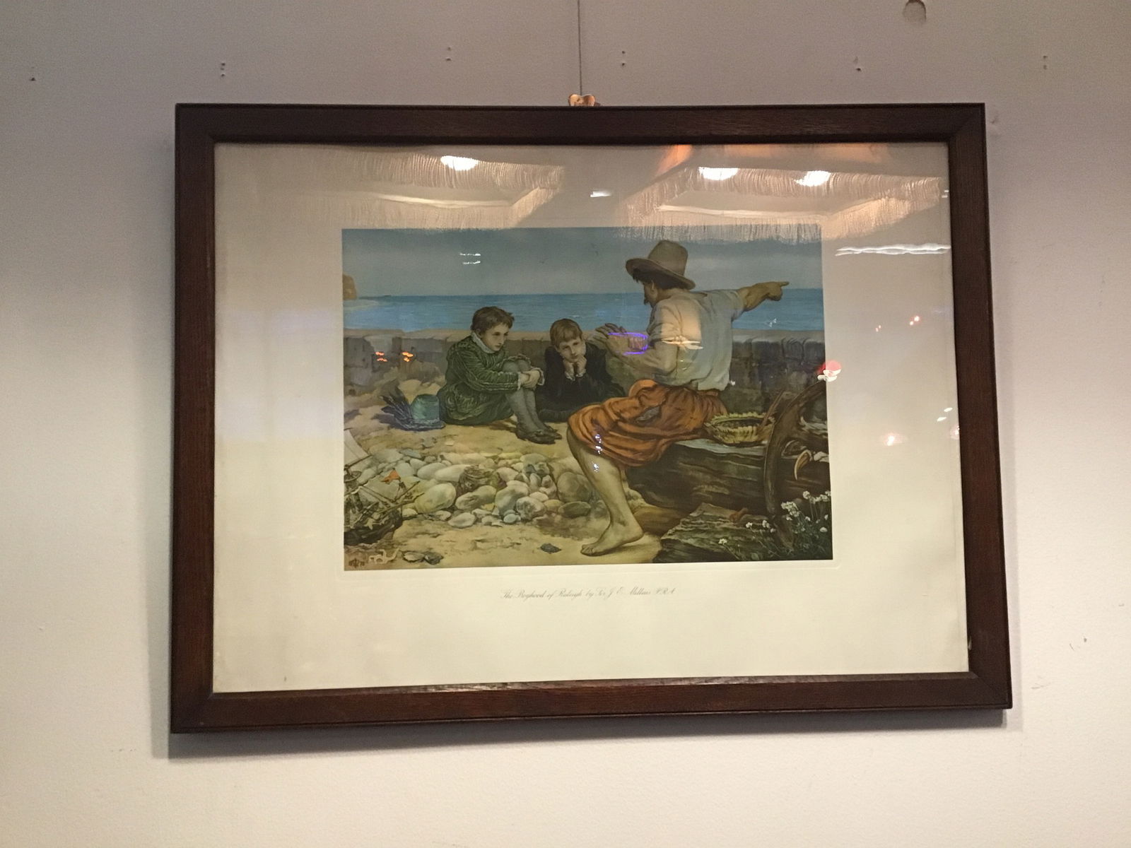 Lovely print of John Everett Millais' painting "The Boyhood of Raleigh." Which depicts famed explorer Sir Walter Raleigh and his brother listening intently to a sailor's stories of sea. Nice print on canvas and in a solid wood frame.