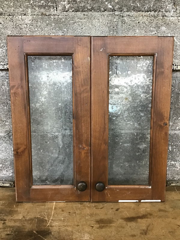 A pair of glass fronted cabinet doors framed by some knotty cherry wood. Has hinged and heavy as hell knobs.