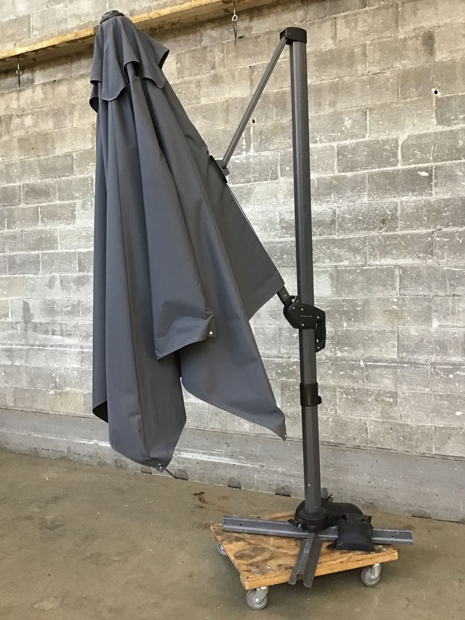 A classic Purple Leaf brand large patio umbrella. The cantilever mechanism works great and it holds up nicely. It is a bit top heavy so it will need stabilization once extended full.