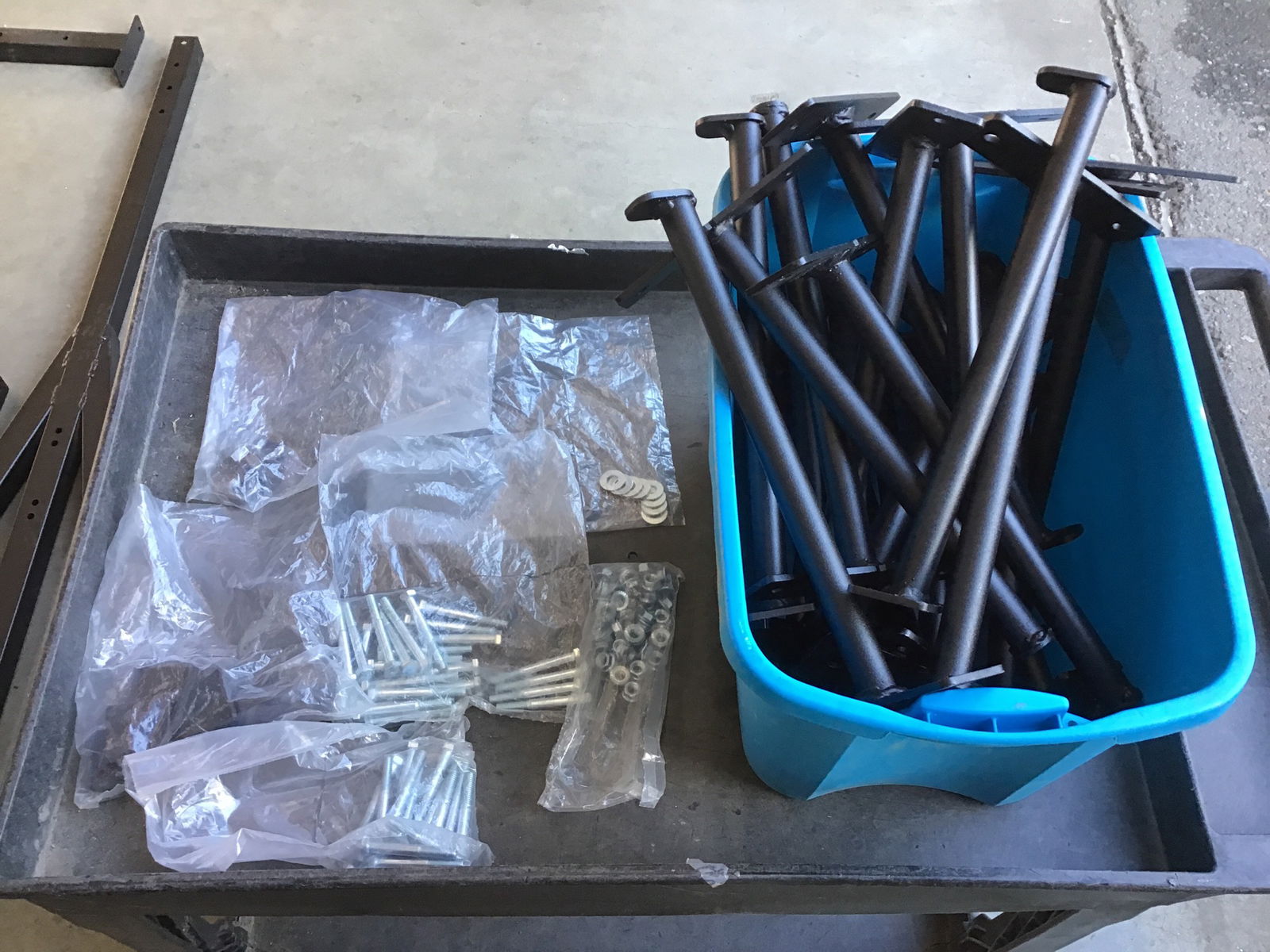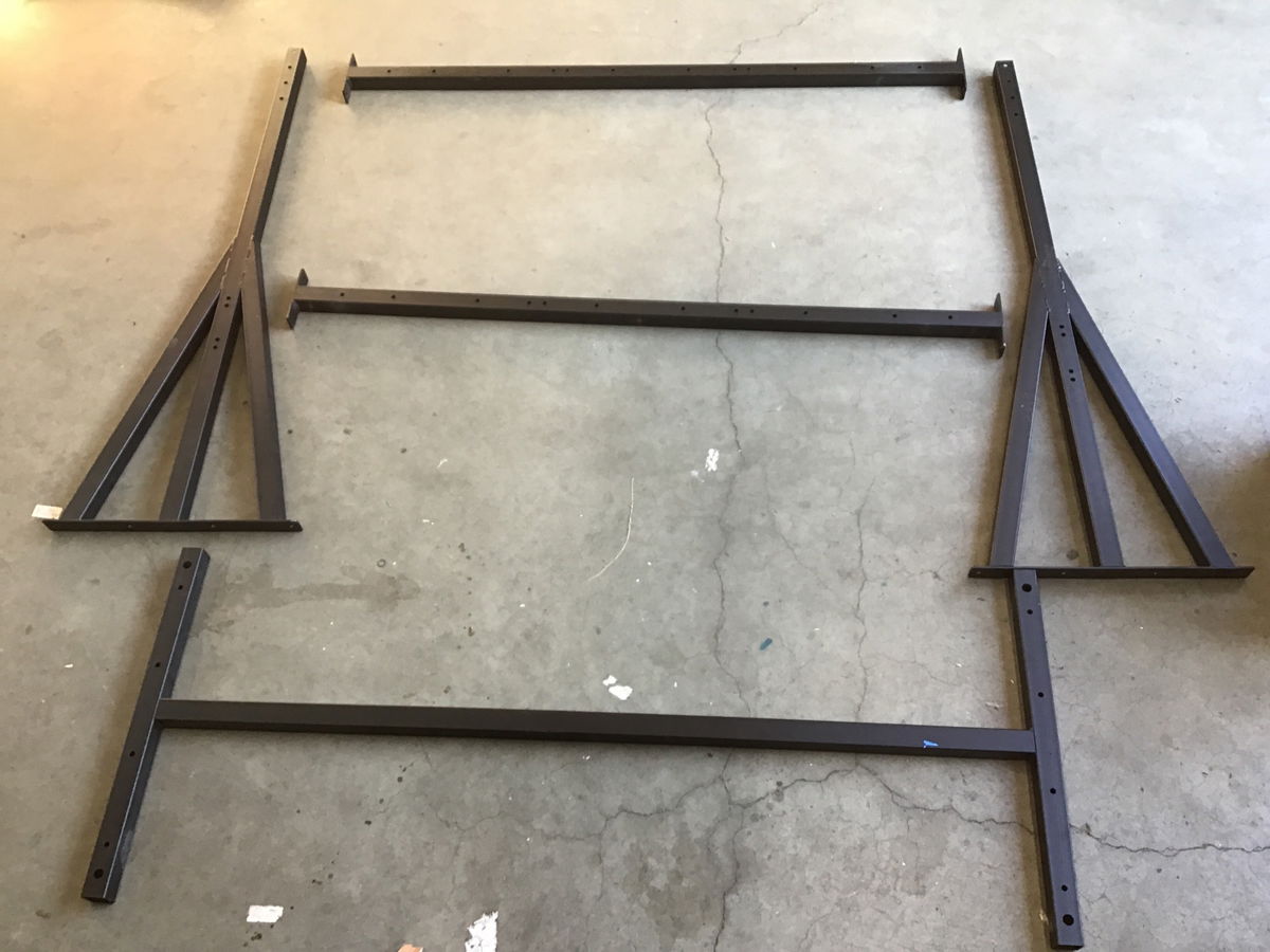 Here we have some kind of large black metal storage stand that comes with two tiers and a plethora of pegs (24) to add or subtract storage areas. We have not assembled it, but it looks to have all pieces and hardware present. No instructions but looks to be fairly straight forward to assemble.
