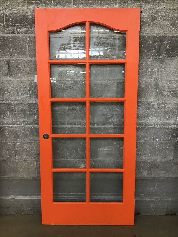 Full-lite interior door painted a wonderful orangey/vermillion color, it's sorta irresistable.