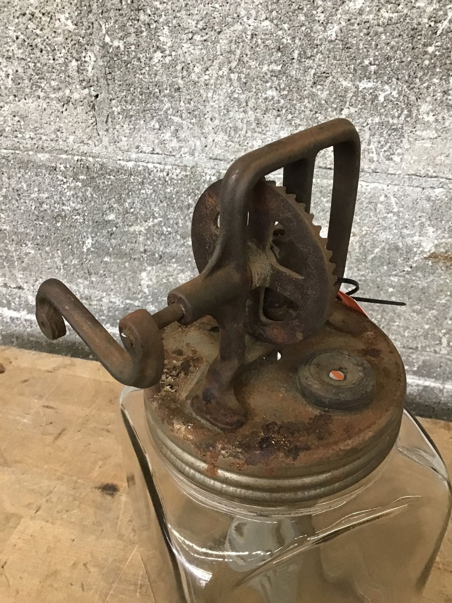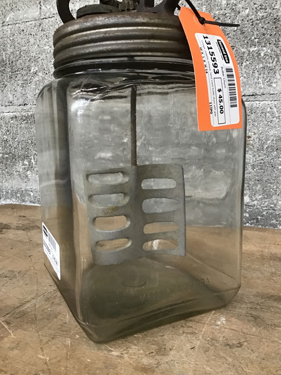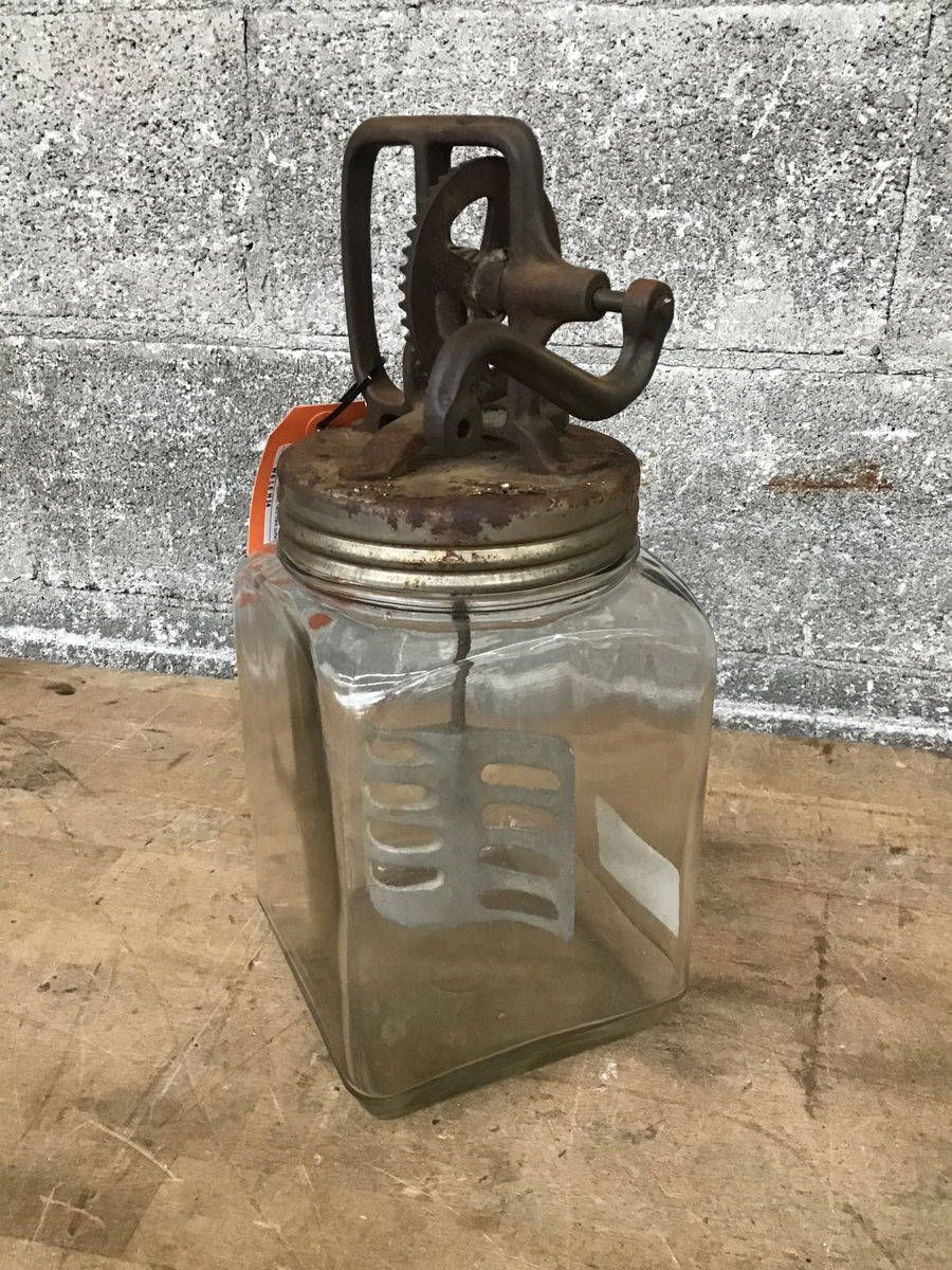 Vintage, possibly antique, hand crank butter churn with glass jar.