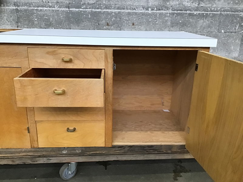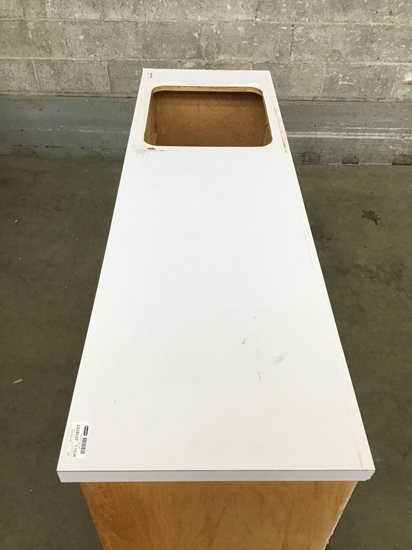 A bathroom vanity plug in and go cabinet. Has three doors, three drawers, all cabinet pull hardware and countertop. Will need a toe kick installed and is ready for a sink.