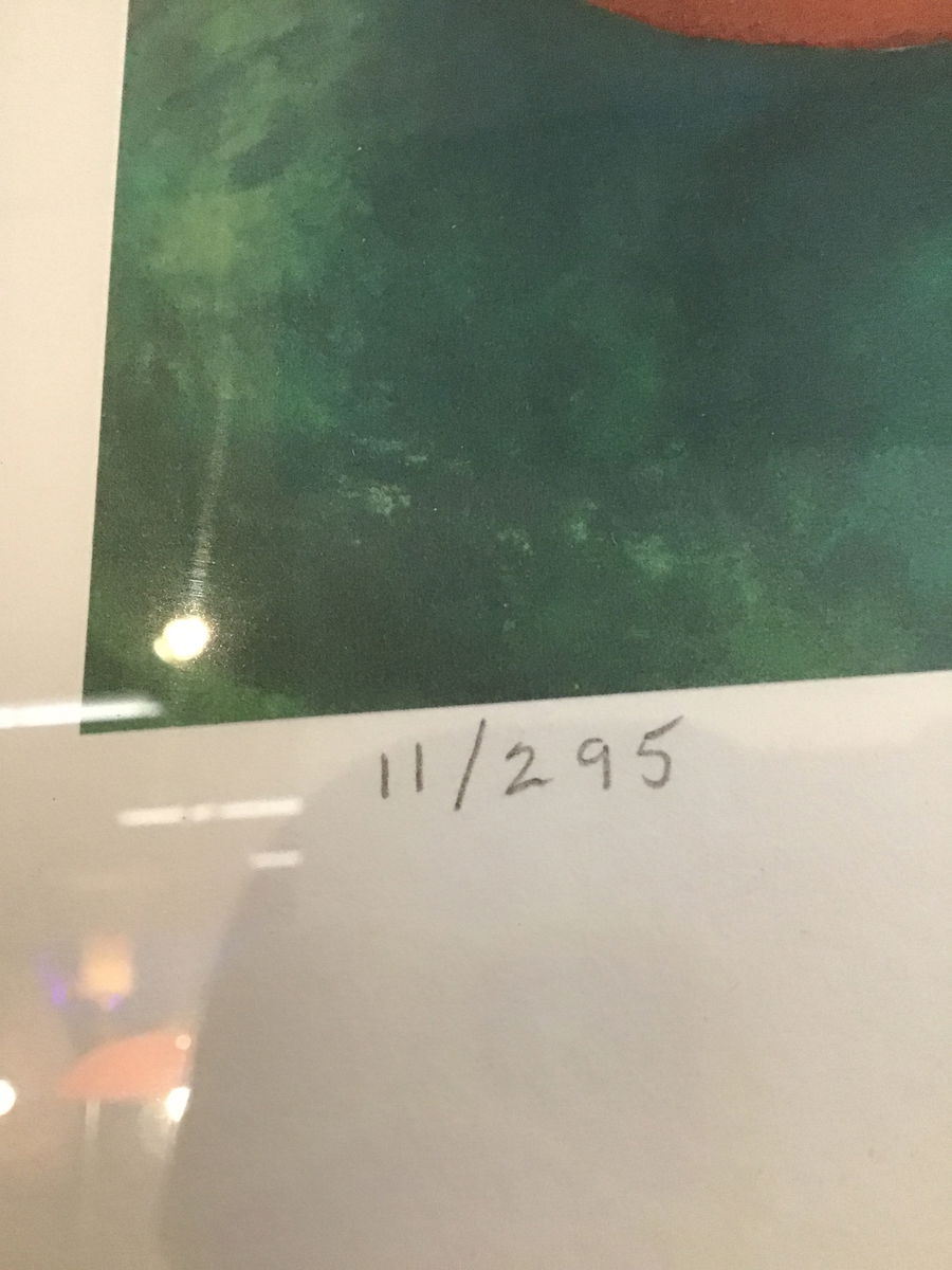 Limited print titled "Potters Pride." Painted by local Seattle artist Alene Rucker, its a limited print with this one numbered 11/295. Print on canvas showing 3 pots in primary colors hanging from a branch. Framed really nicely with the canvas on a brown background, and a simple wood frame.