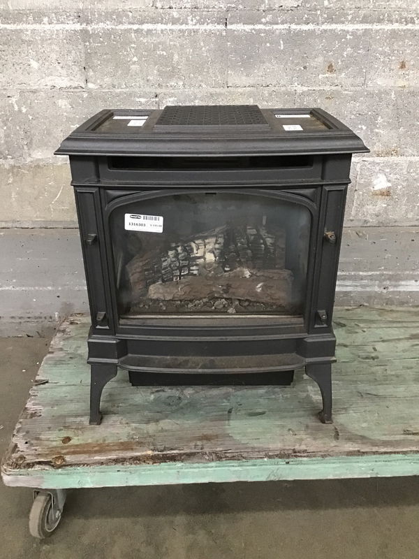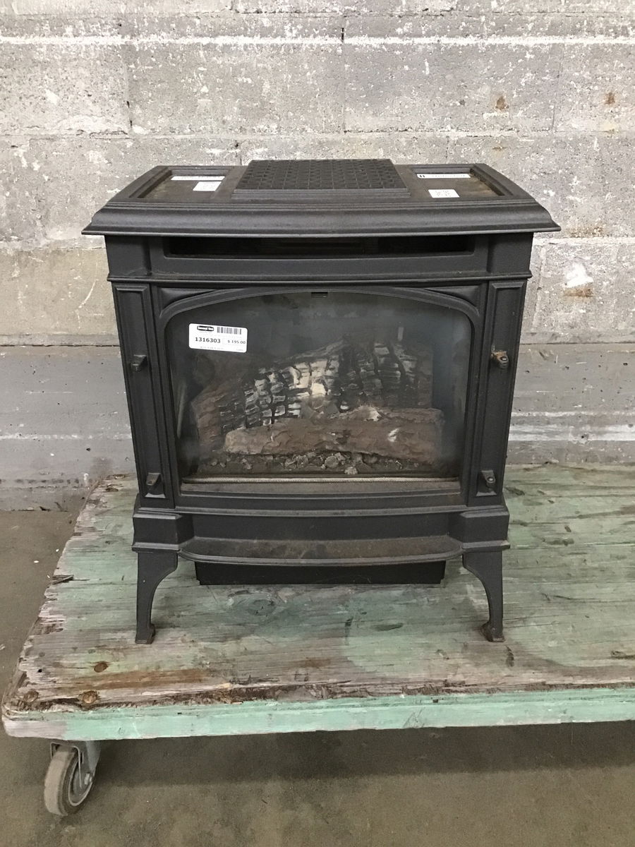A Sturbridge vented gas fireplace heater. With glass doors and blower, freestanding and a solid cast iron body. Looks like it used to have a decorative door on front that is no longer with it. Untested in house but was told it was functional.
