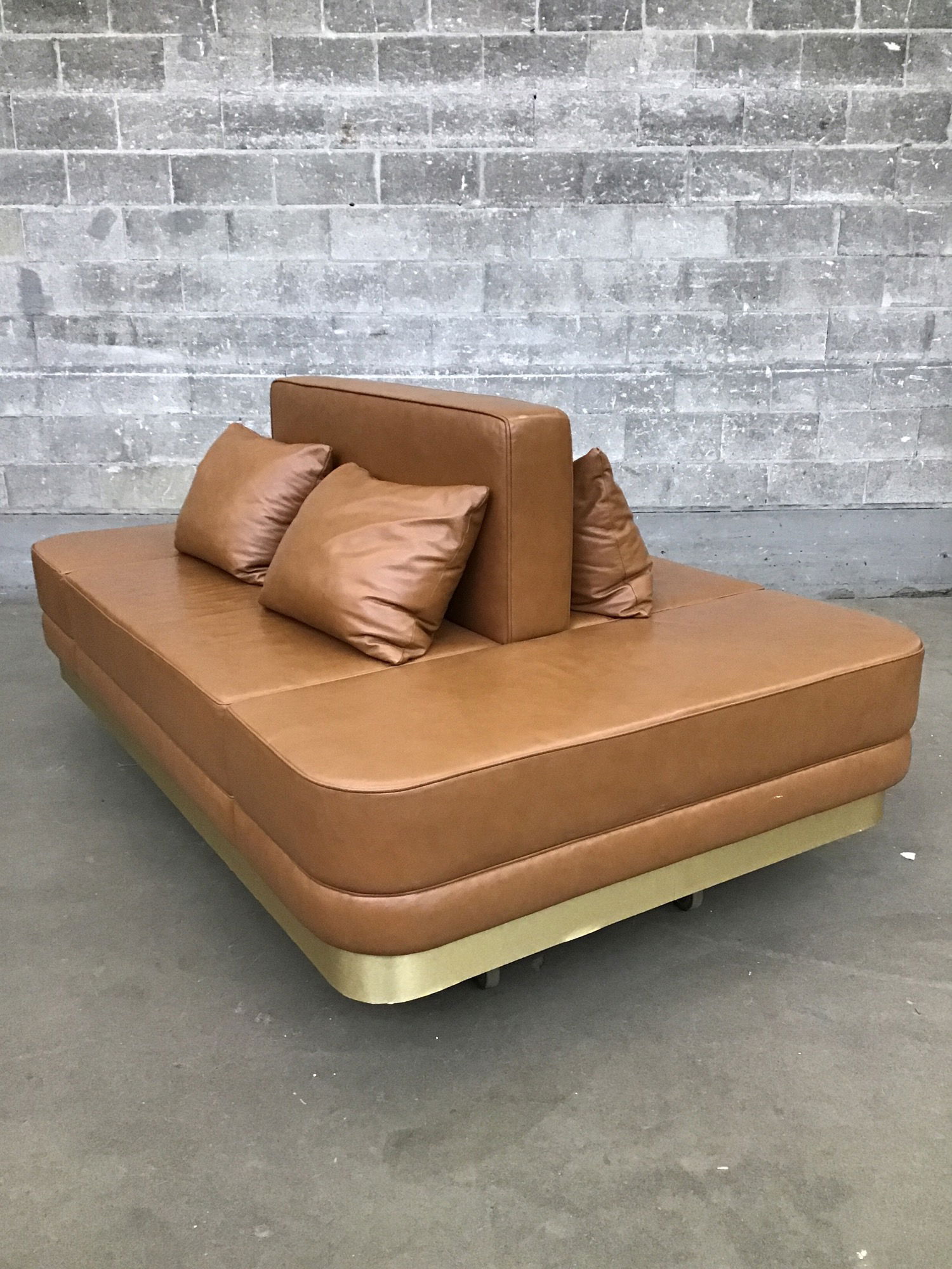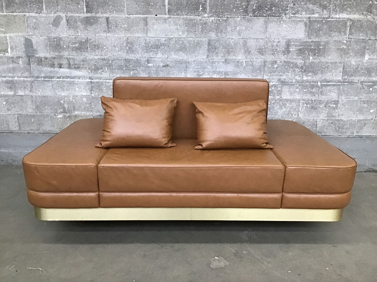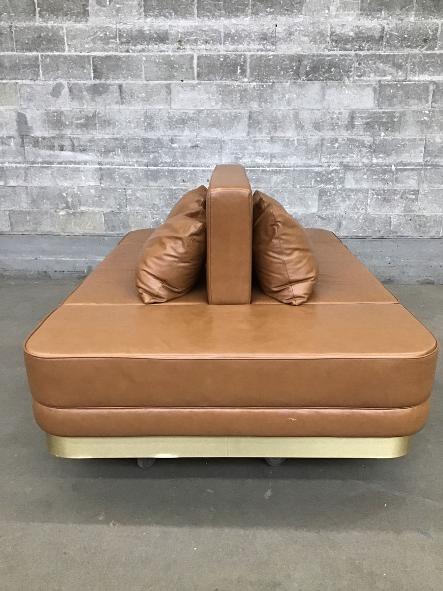 Refined and stylish custom pleather sofa from a fancy lobby that would be excellent for a large living room that needs seating on both sides. Buttery camel pleather with brushed gold accents and clean lines make this piece hard to resist!