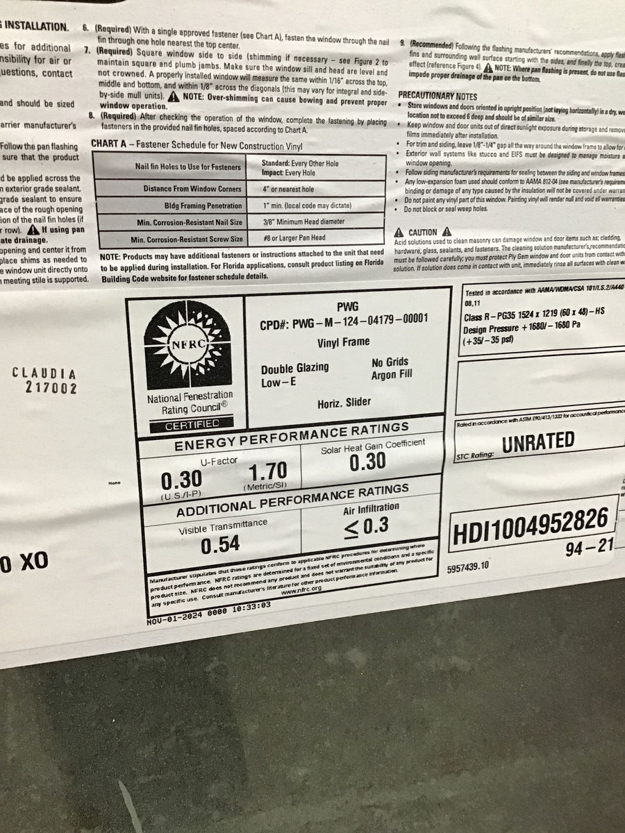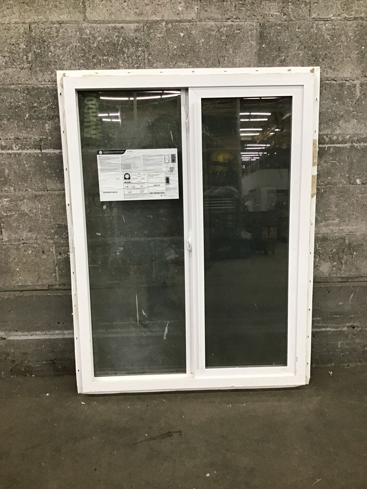 New window with energy tags that was installed briefly but removed before it saw any use. May be dirty with construction debris but is not damaged.