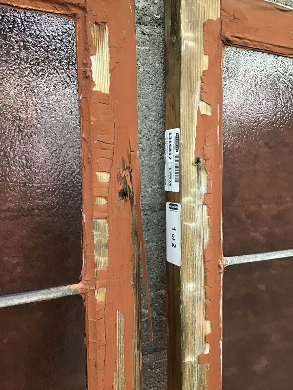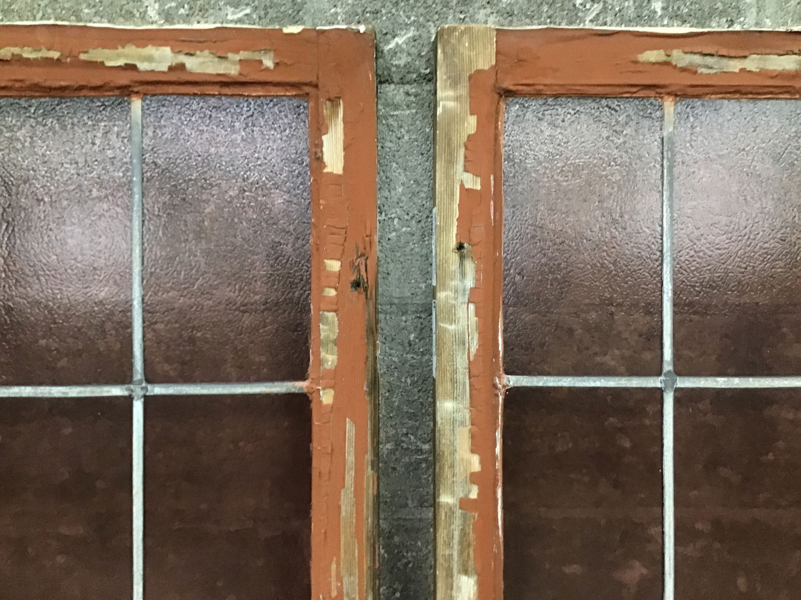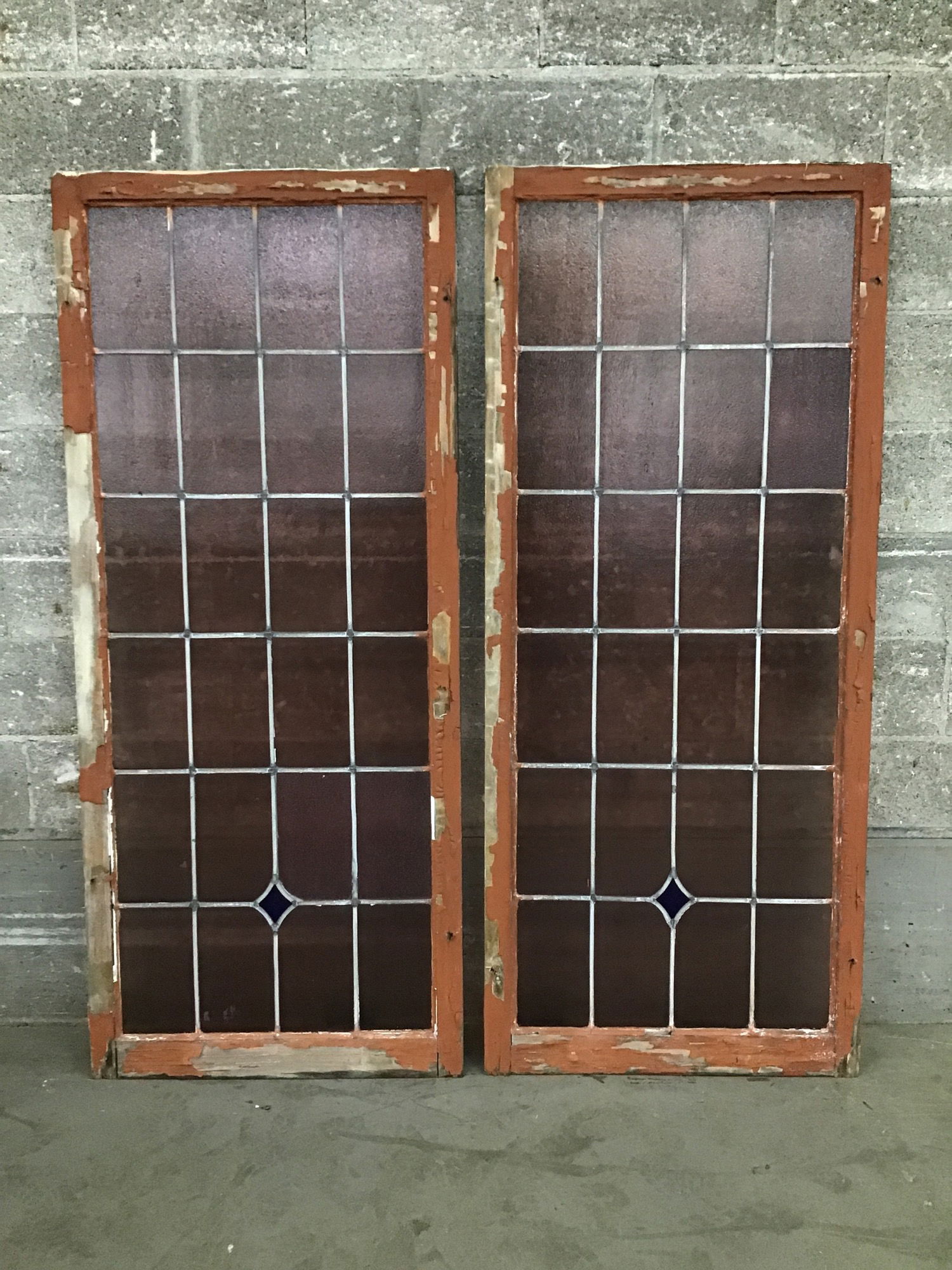 This is a magnificent pair of stained glass windows that was salvaged from a local church turned to mosque. There are 48 panes of true lead divided glass that have a lovely rose color to them as well as varying textures. Features a deep blue diamond insert towards the bottom.