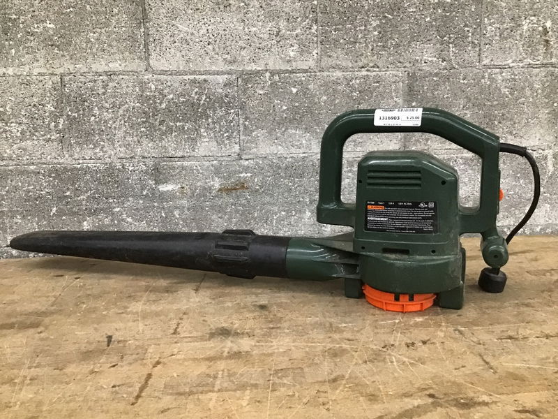 A fully electric leaf blower by Black & Decker, 'Vac N Mulch', Model BV1500 and seems to work just fine when tested in house.